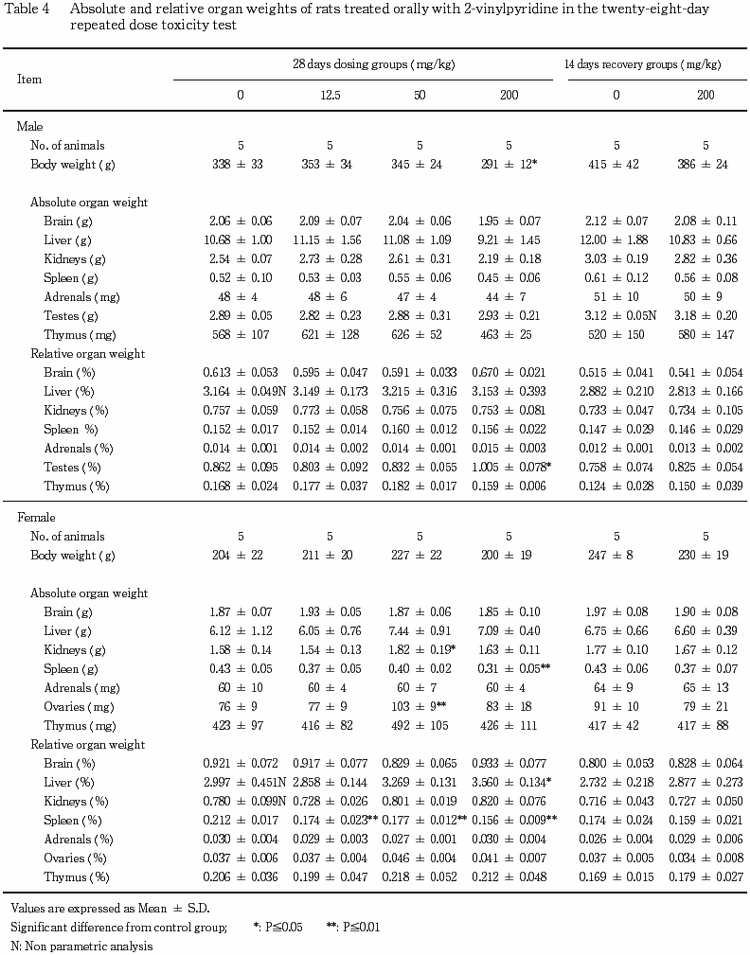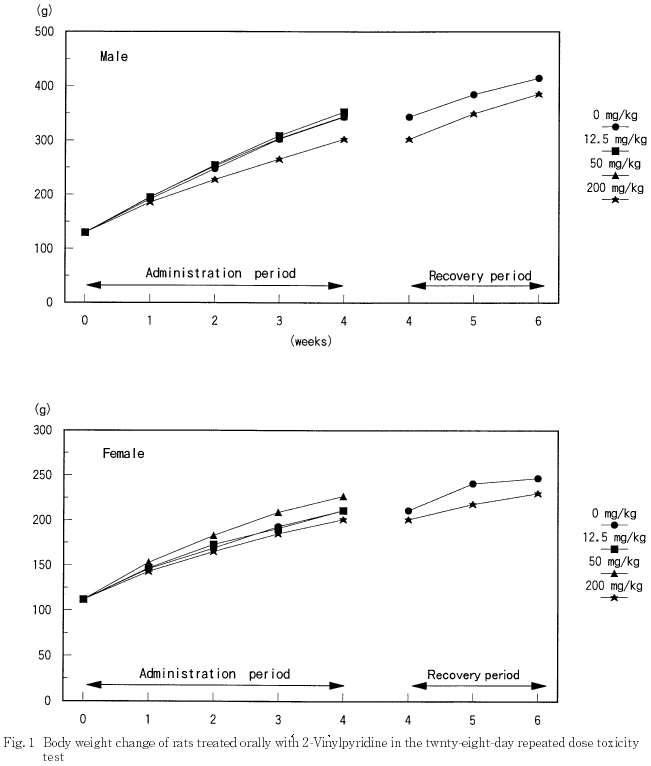 ´ï´±½ÅÎ̬Äê¤Î·ë²Ì¡¤Íº¤Î200 mg/kg·²¤Çǧ¤á¤é¤ì¤¿ÀºÁãÁêÂнÅÎ̤ιâÃÍ¡¤»ó¤Î200 mg/kg·²¤Çǧ¤á¤é¤ì¤¿ç£Â¡¼Â½ÅÎ̤ª¤è¤ÓÁêÂнÅÎ̤ÎÄãÃͤʤé¤Ó¤Ë´Î¡ÁêÂнÅÎ̤ιâÃͤϡ¤¤¤¤º¤ì¤âÈ︳ʪ¼ÁÅêÍ¿¤Ë¤è¤ë±Æ¶Á¤È¹Í¤¨¤é¤ì¤¿¤¬¡¤ÉÂÍýÁÈ¿¥³Ø¸¡ºº¤Î·ë²Ì¤«¤é¤³¤ì¤é¤Î´ï´±¤Ë°Û¾ï¤Ïǧ¤á¤é¤ì¤Ê¤«¤Ã¤¿¡¥¤Þ¤¿¡¤»ó¤Î12.5¤ª¤è¤Ó50 mg/kg·²¤Çǧ¤á¤é¤ì¤¿ç£Â¡ÁêÂнÅÎ̤ÎÄãÃͤϡ¤ÅêÍ¿½ªÎ»»þ¤Ë¤ª¤±¤ë»ó¤ÎÂоȷ²¤Î½ÅÎ̤¬²óÉü´ü´Ö½ªÎ»»þ¤Ë¤ª¤±¤ë½ÅÎ̤ÈÅù¤·¤¯¡¤Èæ³Ó¤·¤¿Âоȷ²¤¬¹âÃÍ·¹¸þ¤Ë¤¢¤Ã¤¿¤¿¤á¤ËÀ¸¤¸¤¿¤â¤Î¤È¹Í¤¨¤é¤ì¡¤È︳ʪ¼Á¤Î±Æ¶Á¤È¤ÏȽÃǤµ¤ì¤Ê¤«¤Ã¤¿¡¥¤½¤Î¾¡¤ÊѲ½¤Î¤ß¤é¤ì¤¿ÍñÁ㤪¤è¤Ó¿Õ¡¤Ï¡¤ÍÑÎ̤ËÂбþ¤·¤¿ÊѲ½¤Ç¤Ï¤Ê¤¤¤³¤È¤«¤é¡¤È︳ʪ¼ÁÅêÍ¿¤Ë¤è¤ëÊѲ½¤Ç¤Ï¤Ê¤¤¤È¹Í¤¨¤é¤ì¤¿¡¥²óÉü´ü´Ö½ªÎ»»þ¤Ç¤Ï¡¤ç£Â¡¡¤´Î¡¤ª¤è¤ÓÀºÁã¤Ë°Û¾ï¤Ïǧ¤á¤é¤ì¤º²óÉü¤¬¤ß¤é¤ì¤¿¡¥