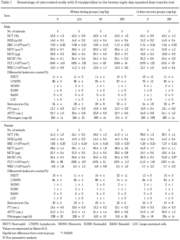 ÅêÍ¿ÎÌÀßÄê¤Î¤¿¤á¤Î2½µ´ÖÈ¿ÉüÅêÍ¿»î¸³¤ò0¡¤30¡¤90¤ª¤è¤Ó270 mg/kg¤Î4ÍÑÎ̤Ǽ»ܤ·¤¿¡¥¤½¤Î·ë²Ì¡¤270 mg/kg·²¤Ç¤Ï°ìÈ̾õÂÖ¤ÎÊѲ½¤È¤·¤Æ¡¤»óͺÁ´Îã¤ËÈïÌÓ¤ò±ø¤¹ÄøÅÙ¤Îή޷¤¬Ç§¤á¤é¤ì¡¤¤µ¤é¤Ë°ìÉô¤ÎÎã¤Ë¶Ãسȿ¼Í¤¬´Ñ»¡¤µ¤ì¤¿¡¥¤Þ¤¿¡¤ÂνŤÏͺ¤ÇÁý²ÃÍÞÀ©¤¬Ç§¤á¤é¤ì¡¤·ì±Õ³ØÅª¸¡ºº¤Ç¤Ï»óͺ¤Ç¹¥ÃæµåÈæÎ¨¤ÎÁý²Ã¡¤·ì±ÕÀ¸²½³ØÅª¸¡ºº¤Ç¤Ïͺ¤ÇGOT¤Î¹âÃͤª¤è¤ÓÁí¥³¥ì¥¹¥Æ¥í¡¼¥ë¤ÎÄãÃÍ¡¤»ó¤ÇGPT¤Î¹âÃͤ¬Ç§¤á¤é¤ì¤¿¡¥´ï´±½ÅÎ̬Äê¤Ç¤Ï¡¤»óͺ¤È¤â¤Ë270 mg/kg·²¤ÇÉû¿Õ¤¬¹âÃͤò¼¨¤·¡¤¶»Á£¤¬ÄãÃͤò¼¨¤·¤¿¡¥ÉÂÍýÆù´ã´Ñ»¡¤Ç¤Ï¡¤270 mg/kg¤ª¤è¤Ó90 mg/kg·²¤Î»óͺ¤ÇÁ°°ßÇ´Ëì¤ÎÈî¸ü¤¬Ç§¤á¤é¤ì¡¤¤µ¤é¤Ë270 mg/kg·²¤Î»óͺ¤Ë¤Ï°ß¤È¼þ°ÏÁÈ¿¥¤ÎÌþÃ太¤è¤ÓÁ°°ß¤ÎÄÙáç¤âǧ¤á¤é¤ì¤¿¡¥