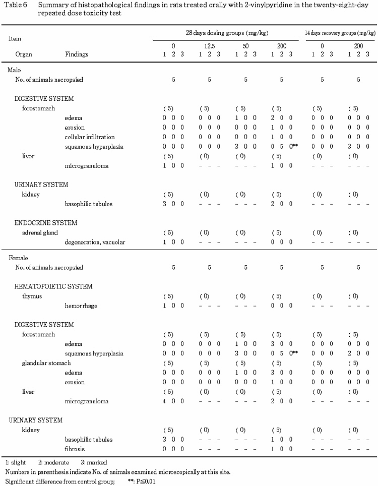 È︳ʪ¼ÁÅêÍ¿¤Î±Æ¶Á¤È¹Í¤¨¤é¤ì¤ëÉÂÊѤȤ·¤Æ¡¤Á°°ß¤Î٨ʿ¾åÈéÁýÀ¸¤¬200 mg/kg·²¤Î»óͺ¤ÎÁ´Îã(ÃæÄøÅÙ)¤È50 mg/kg·²¤Î»óͺ¤Î3Îã(·ÚÅÙ)¤Ë´Ñ»¡¤µ¤ì¤¿¡¥¤µ¤é¤ËÅý·×³ØÅª¤ÊͰպ¹¤Ï¤Ê¤¤¤¬Á°°ßÇ´Ëì²¼¤ÎÉâ¼ð¤¬200 mg/kg·²¤Îͺ¤Î2Î㡤»ó¤Î3Îã¤È50 mg/kg·²¤Î»óͺ¤Î1Îã¤Ë´Ñ»¡¤µ¤ì¤¿¤Û¤«¡¤¤Ó¤é¤ó¤äºÙ˦¿»½á¤â200 mg/kg·²¤Îͺ¤Î1Îã¤Ë´Ñ»¡¤µ¤ì¤¿¡¥Á£°ß¤Ç¤ÏÇ´Ëì²¼¤ÎÉâ¼ð¤¬»ó¤Î200 mg/kg·²¤Î3Îã¤È50 mg/kg·²¤Î1Îã¤Ë¡¤¤Ó¤é¤ó¤¬200 mg/kg·²¤Î1Îã¤Ë¤½¤ì¤¾¤ì´Ñ»¡¤µ¤ì¤¿¡¥
