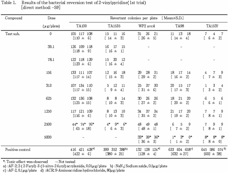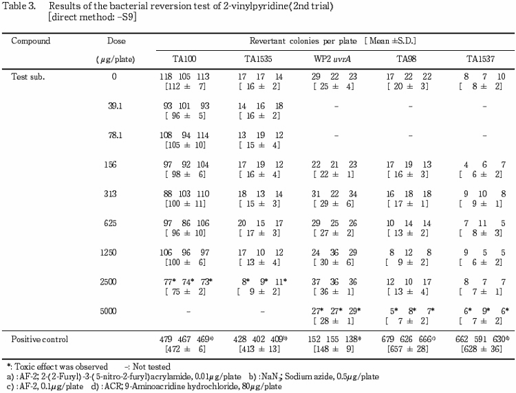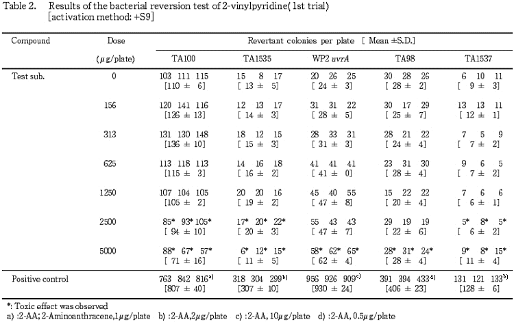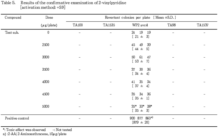 以上の結果より,本試験条件下では2-ビニルピリジンは,変異原性を有する(陽性)と結論した.
