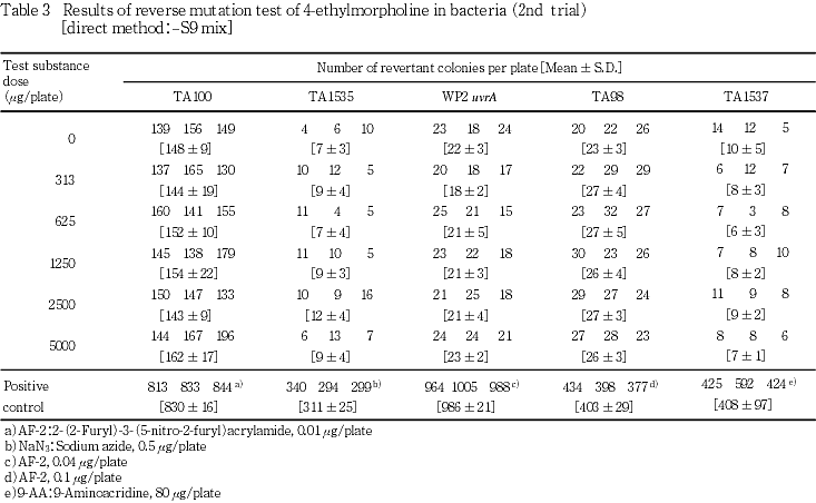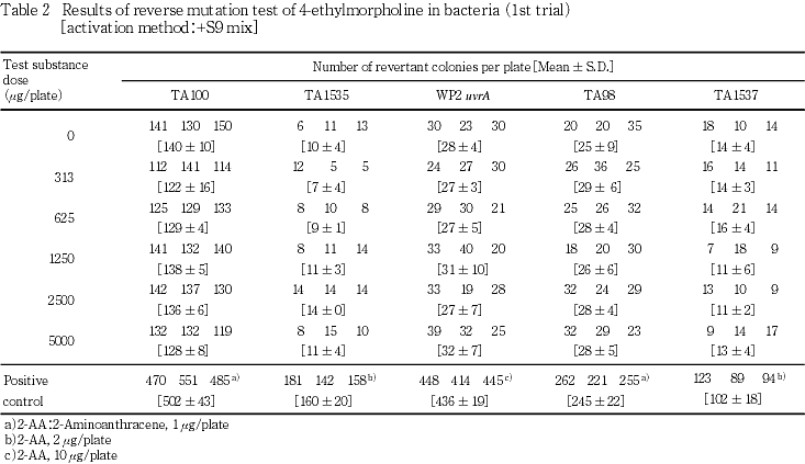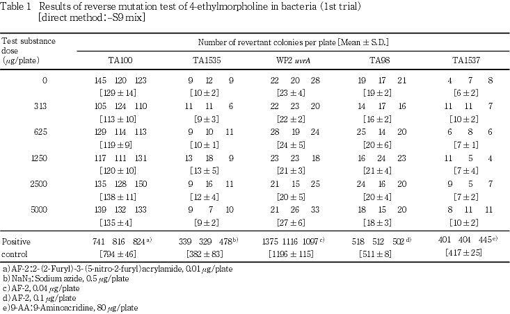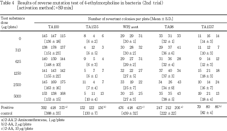 以上の成績から,4-エチルモルホリンの細菌に対する遺伝子突然変異誘発性は陰性と判定した.