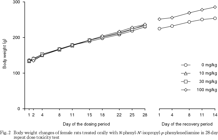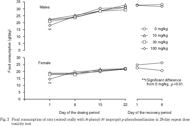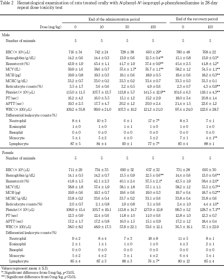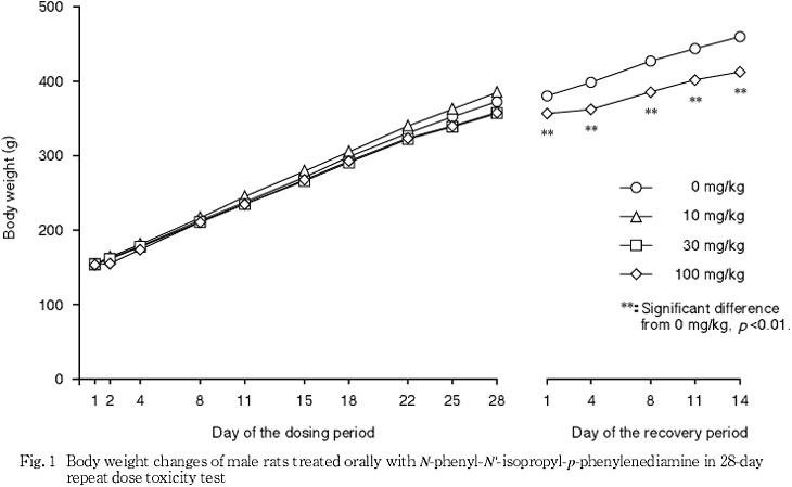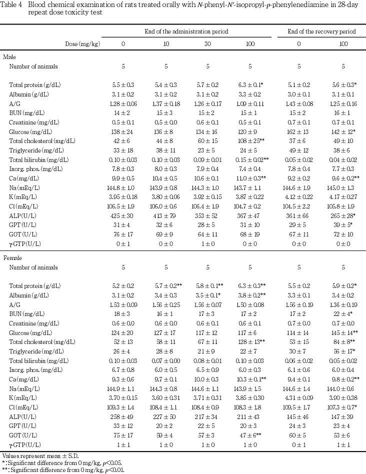以上の結果から,本試験条件下におけるN-フェニル-N'-イソプロピル-p-フェニレンジアミンの無作用量は雄で10 mg/kg,雌では10 mg/kg未満であると考えられた.また,被験物質の標的器官は肝臓,血液,腎臓であることが示唆され,主として肝重量の増加を伴う好酸性肝細胞肥大および小葉中間帯の脂肪化,溶血性貧血,尿蛋白の上昇が生じることが明らかとなった.2週間の投与中止によって,溶血は終息して貧血は回復過程にあり,好酸性肝細胞肥大および小葉中間帯の脂肪化は軽減したが,肝細胞の単細胞壊死は明らかな回復性を示さなかった.
