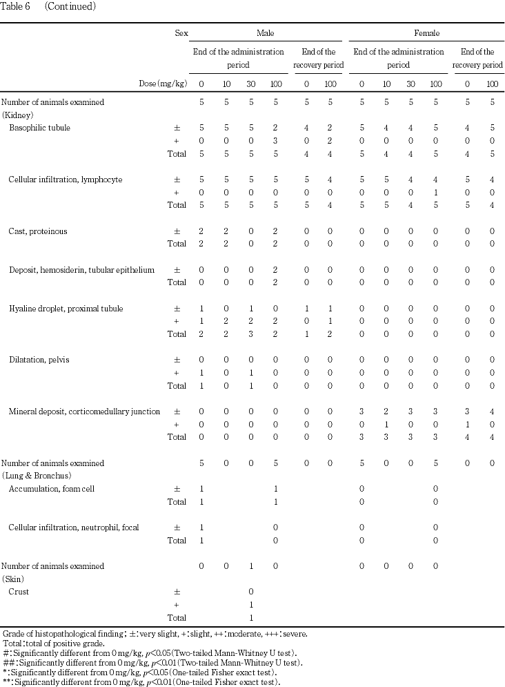 腎臓では,100 mg/kg投与群の雌雄で器官重量が増加したが,雄3例で好塩基性尿細管の僅かな増強が認められ,この雄3例中2例で軽微なヘモジデリン沈着が認められた以外には被験物質投与に起因すると考えられる明らかな病理学的変化はなかった.しかし,投与第4週および回復試験終了時に,100 mg/kg投与群ではこの雄3例を含む雌雄数例で中等度以上尿蛋白が検出され,被験物質の急性経口毒性試験では,死亡例で近位尿細管上皮の変性あるいは壊死が認められ,腎障害が示唆されているため,本試験でも尿細管上皮細胞に変性ないし壊死が生じた可能性がある.また,これらの変化は投与中止により回復しなかったものの,程度は軽減する傾向にあり,回復性が示唆された.この他,投与第3日の尿検査では100 mg/kg投与群の雌雄で沈渣中の結晶陰性例が増加する傾向にあった.沈渣中の結晶は,尿のpHあるいは尿量などに左右されるが,投与第3日には尿量を測定しておらず,pHは対照群と比較して大差がなかったことから,結晶の変化が被験物質投与に起因する可能性は否定できないもののその原因は不明であった.