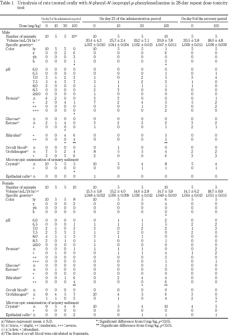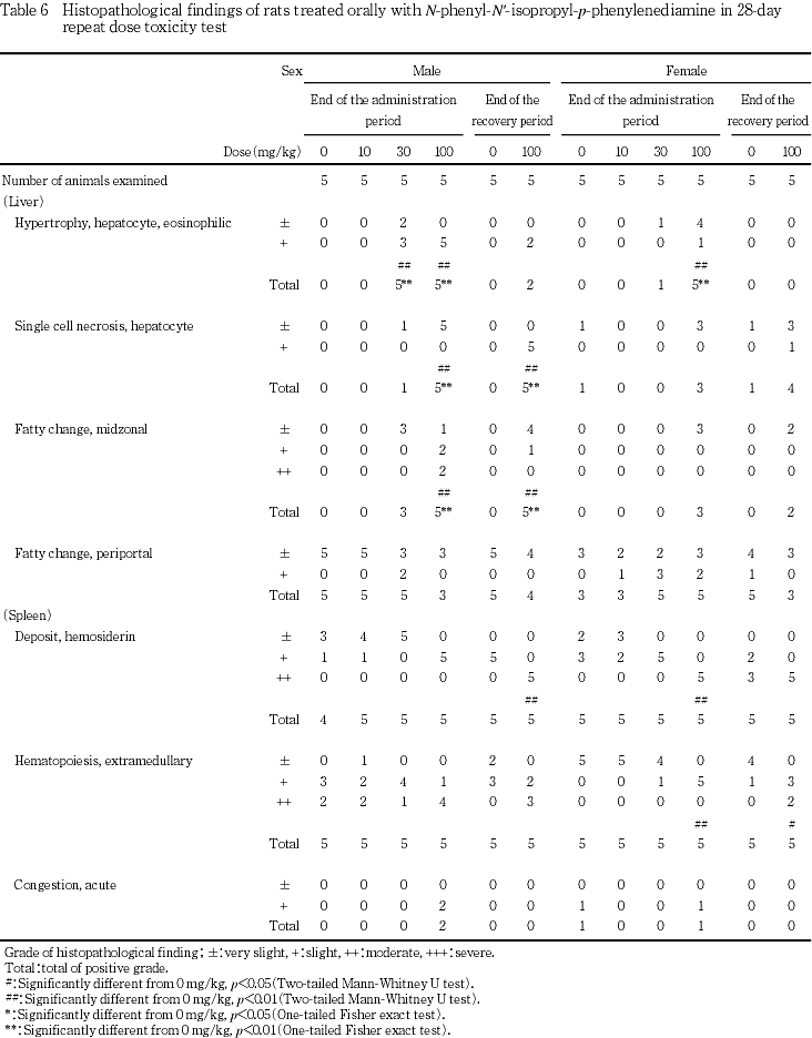 100 mg/kg投与群の雌雄および30 mg/kg投与群の雄で尿が黄色から褐色を呈した.しかし,投与中止翌日には回復したこと,尿検査時に潜血反応が陰性であったこと,尿中にN-フェニル-N'-イソプロピル-p-フェニレンジアミンあるいはその代謝産物が排泄されるということ8-10),本被験物質は紫褐色を呈し,24時間尿の上層部は暗紫色を示したことから,溶血による褐色化ではなく,尿中に排泄された被験物質あるいはその代謝物に由来する変化であると考えられた.また,100 mg/kg投与群の雄で観察された緑色調の便も被験物質もしくはその代謝産物に由来する可能性が示唆された.なお,これら色調の変化は雄で強く認められたが,代謝の性差によるものであるのかは判断できず,肝臓の好酸性肝細胞肥大,肝小葉中間帯の脂肪化,血漿総蛋白濃度の上昇などいくつかの項目で認められた雌雄差も,明瞭なものではなかった.