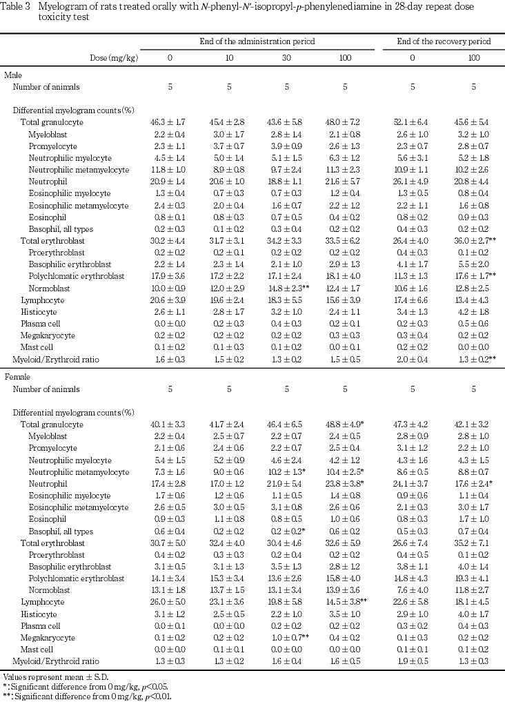 回復試験終了時屠殺例では,100 mg/kg投与群の雌雄で,血色素量,ヘマトクリット値,平均赤血球容積および平均赤血球血色素量が有意に減少し,血小板数および網状赤血球比率が有意に上昇した.100 mg/kg投与群の雄では,単球比率が有意に低下したが,投与期間中には低下しておらず,同系統同週齢の動物のコントロールデータ6, 7)と比較すると対照群の単球比率が高かったことから,被験物質投与による変化ではないと判断した.骨髄像検査では,100 mg/kg投与群の雌雄で多染性赤芽球比率および総赤芽球比率の上昇ならびにM/E比の低下が認められ,雄で有意な変化となった.また,雌では,好中球比率が有意に低下した.