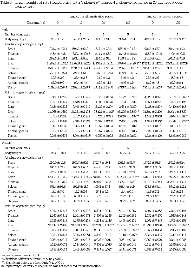 回復試験期間終了時屠殺例では,100 mg/kg投与群の雌雄で肝重量が増加し,雌雄の相対重量および雌の実重量が有意な増加となった.また,雄では,脾臓の実重量および相対重量ならびに腎臓の相対重量が有意に増加した.この他,雄では脳の相対重量が有意に増加したが,投与期間終了時に認められなかった変化であり,剖検時体重が対照群と比較して低かったことも考慮して,被験物質投与あるいは投与中止による変化ではないと判断した.