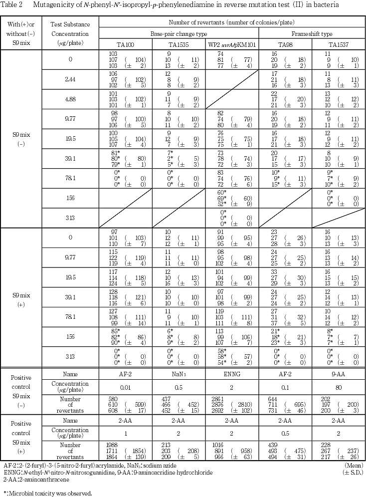 以上の結果から,N-フェニル-N'-イソプロピル-p-フェニレンジアミンは本試験系において変異原性を有さない(陰性)と判定した.