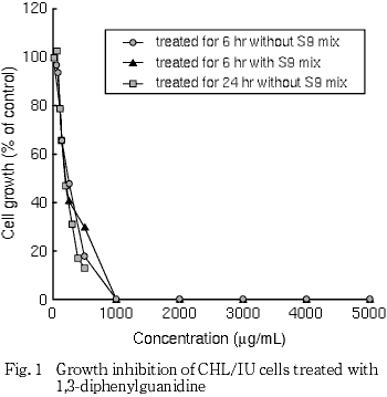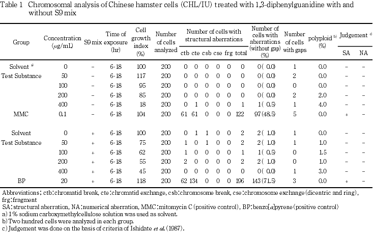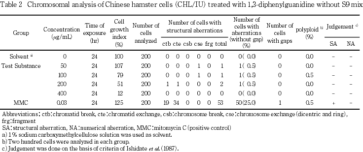 以上の結果より,本試験条件下では1,3-ジフェニルグアニジンは,染色体異常を誘発しない(陰性)と結論した.