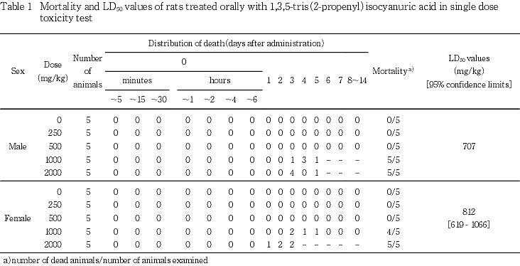 死亡は250及び500 mg/kg投与群の雌雄ともにみられなかったが,1000 mg/kg投与群で雄5/5例と雌4/5例,2000 mg/kg投与群で雌雄各5/5例にみられた.これらのことから,LD50値は雄で707 mg/kg,雌で812 mg/kg (95 %信頼限界619〜1066 mg/kg)であった.