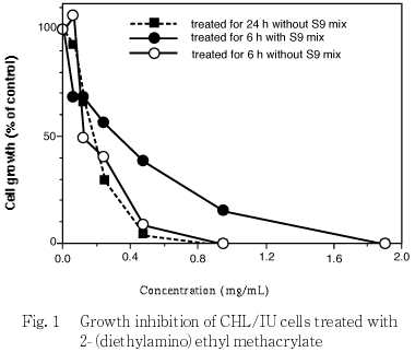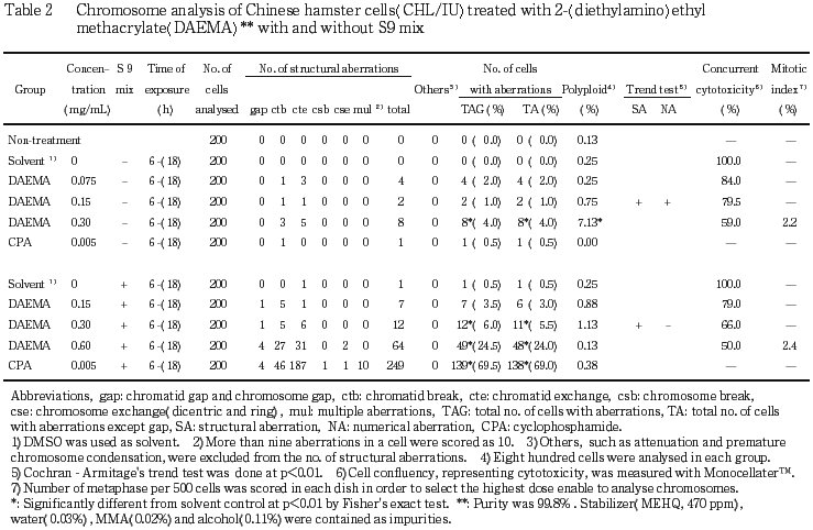 従って,2-(ジエチルアミノ)エチルメタクリラートは,上記の試験条件下で,試験管内のCHL/IU細胞に染色体異常を誘発すると結論した.