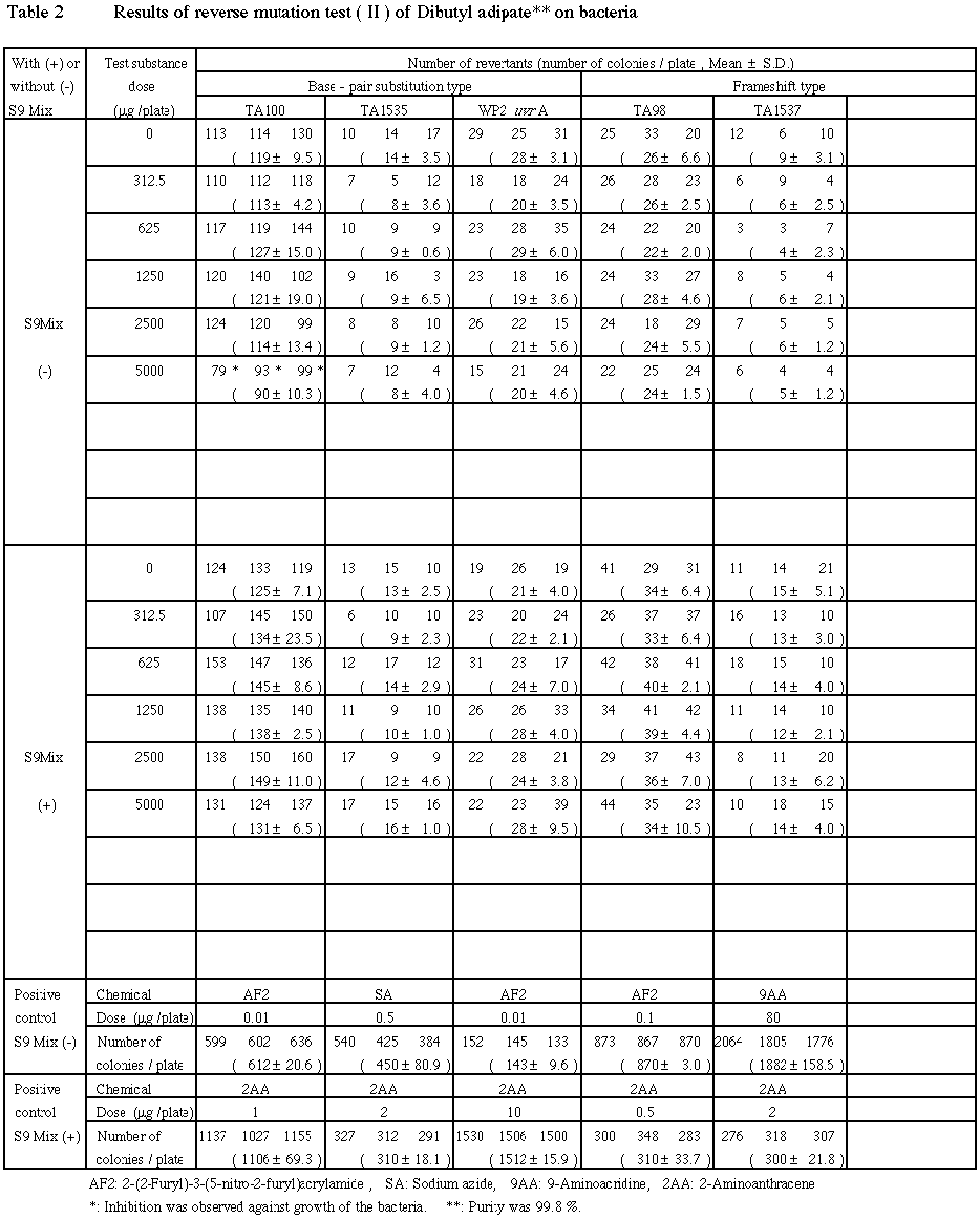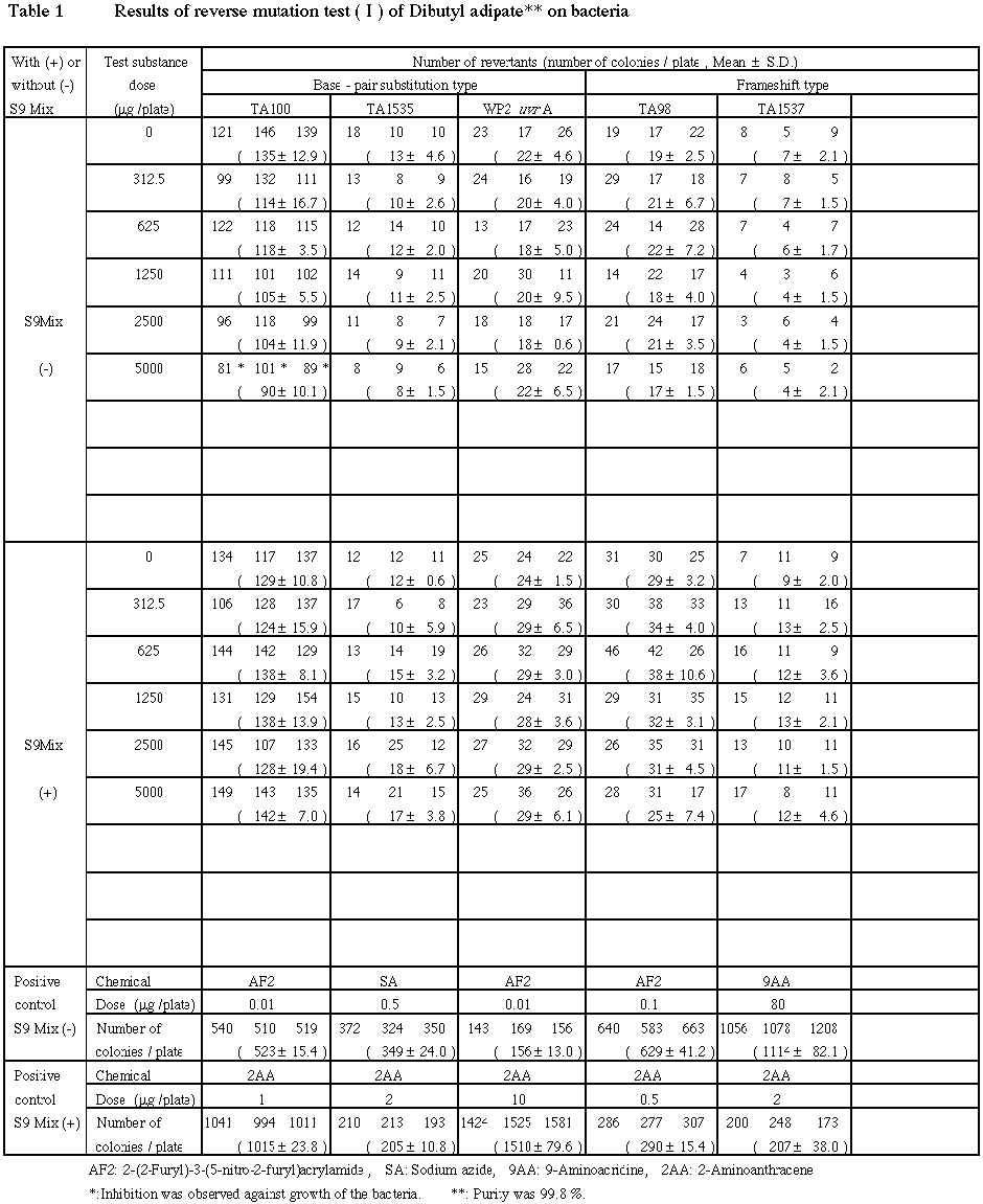 その結果,2回の本試験とも,用いた5種類の検定菌について,いずれの用量でも溶媒対照値の2倍以上となる変異コロニー数の増加が認められなかったことから,アジピン酸ジブチルは,用いた試験系において変異原性を有しない(陰性)と判定された.