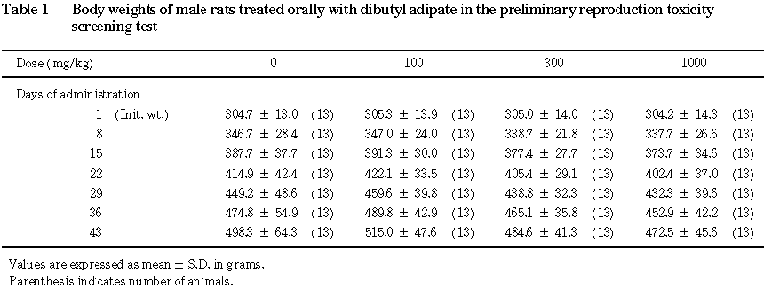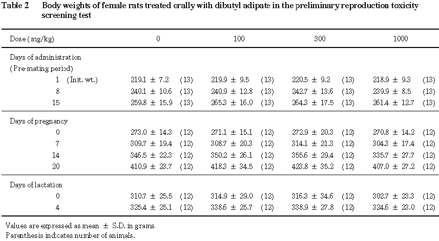 これらのことから,本試験条件下では,アジピン酸ジブチルの親動物に対する無毒性量は 300 mg/kg,生殖に対する無毒性量は1000 mg/kg,出生児に対する無毒性量は300 mg/kgであると推察される.