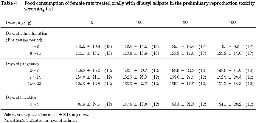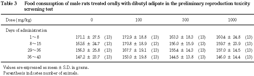 これらのことから本試験の条件下では,アジビン酸ジブチルの親動物に対する無影響量は 300 mg/kg,生殖能力に対する無影響量は1000 mg/kg,次世代児に対する無影響量は300 mg/kgと推定される.