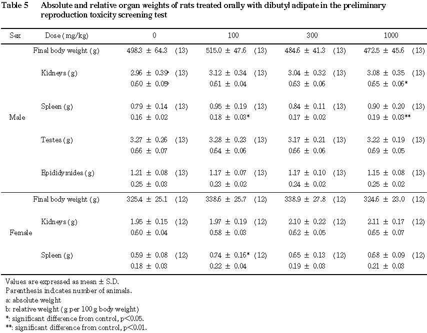 その結果,いずれの投与群においても死亡は認められず,また,毒性と考えられる一般状態の変化も観察されなかった.体重は, 1000 mg/kg投与群の雄においてやや低値を示したが,雌の体重および雌雄の摂餌量については,対照群とアジピン酸ジブチル各投与群との間に差はみられなかった.剖検および内部生殖器の組織検査では,アジピン酸ジブチル投与に起因したと考えられる異常は認められなかった.剖検時に測定した腎臓の重量は,1000 mg/kg投与群において雌雄とも高値を示した.