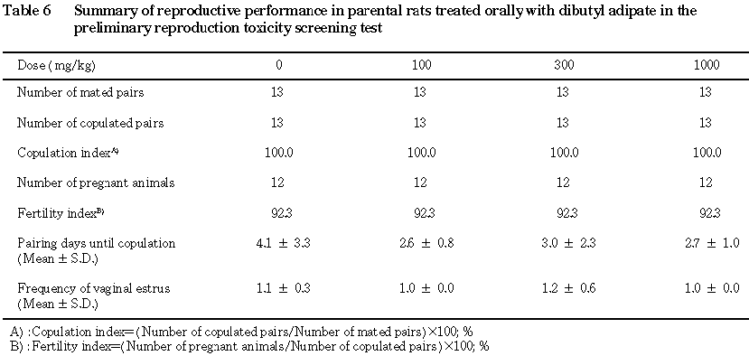雌雄動物の交尾率,受胎率,さらには雌動物の妊娠維持,分娩および哺育に関して,アジピン酸ジブチル投与に起因したと考えられる異常は認められなかった.