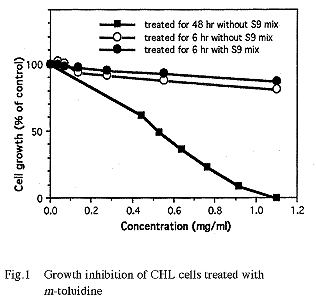 その結果,m-トルイジンの約50%の増殖抑制を示す濃度を,50%をはさむ2濃度の値より算出したところ,直接法では0.52mg/mlとなった.一方,代謝活性化法では1.1mg/ml(10mM)の濃度においても50%を越える増殖抑制作用は認められなかった(Fig. 1).