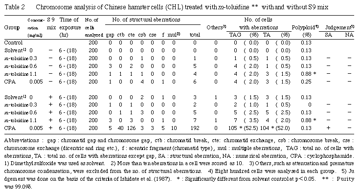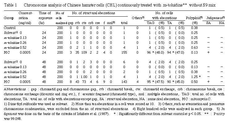 以上の結果より,m-トルイジンは,上記の試験条件下で試験管内のCHL細胞に染色体異常を誘発しないと結論した.