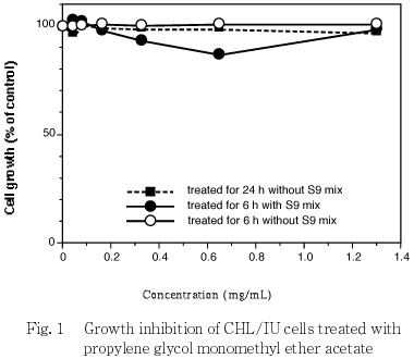 従って,プロピレングリコールモノメチルエーテルアセテートは,上記の試験条件下で,試験管内のCHL/IU細胞に染色体異常を誘発しないと結論した.