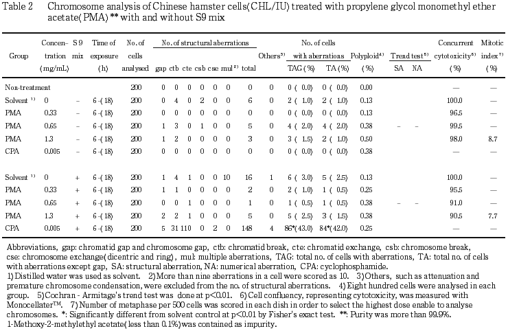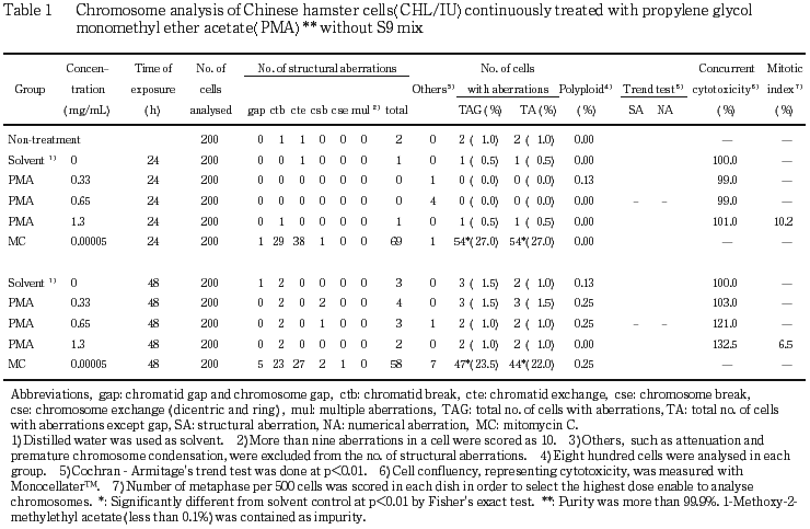 以上の結果より,プロピレングリコールモノメチルエーテルアセテートは,上記の試験条件下で染色体異常を誘発しないと結論した.