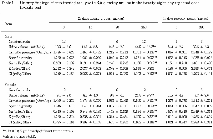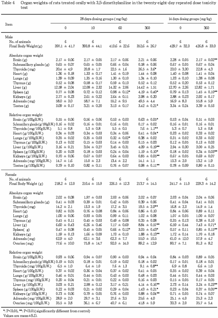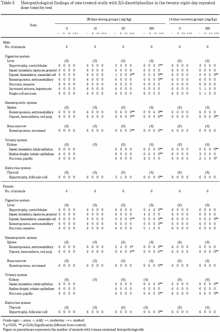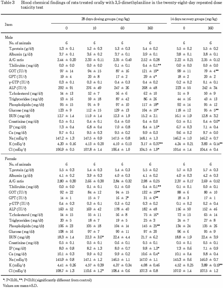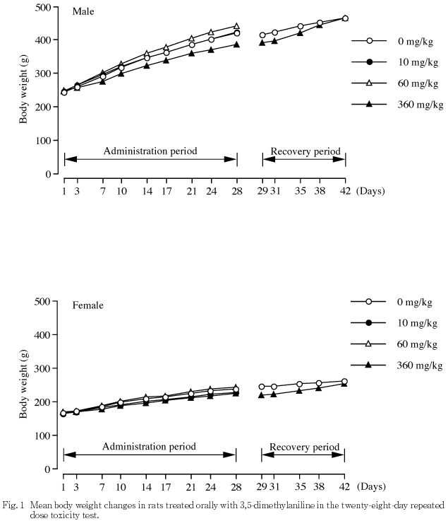 3,5-¥¸¥á¥Á¥ë¥¢¥Ë¥ê¥óÅêÍ¿¤Ë¤è¤ë»àË´¤Ï¤¤¤º¤ì¤Î·²¤Ë¤â¤Ê¤«¤Ã¤¿¡¥°ìÈ̾õÂ֤δѻ¡¤Ç¤Ï¡¤360 mg/kg·²¤Î»óͺ¤Î¿¿ôÎã¤Ç¥Á¥¢¥Î¡¼¥¼¡¤ÈéÉæÁóÇò¤ª¤è¤Óή޷¤¬¡¤»óͺ¤Î¾¯¿ô¤Ê¤¤¤·È¾¿ôÎã¤Ç´ãµåÆÍ½Ð¤ª¤è¤Ó¤è¤í¤á¤Êâ¹Ô¤¬Ç§¤á¤é¤ì¤¿¡¥¥¢¥Ë¥ê¥ó·Ï²½¹çʪ¤Ç¤Ï¡¤¶¦Ä̤·¤¿ÆÇÀ¤È¤·¤Æ¥á¥È¥Ø¥â¥°¥í¥Ó¥ó·ì¾É¤ÈÉϷ줬À¸¤¸¤ë3)¤³¤È¤¬ÃΤé¤ì¤Æ¤ª¤ê¡¤Ëܻ¤Ç¤â¥á¥È¥Ø¥â¥°¥í¥Ó¥ó¤ÎÁý²Ã¤ª¤è¤ÓÉϷ줬ǧ¤á¤é¤ì¤¿¤³¤È¤«¤é¡¤¥Á¥¢¥Î¡¼¥¼¤ª¤è¤ÓÈéÉæÁóÇò¤Ï¤³¤ì¤é¤Ëµ¯°ø¤·¤¿¤â¤Î¤È¹Í¤¨¤é¤ì¤¿¡¥Î®Þ·¤Ë¤Ä¤¤¤Æ¤Ï¡¤°ÛÀÂΤǤ¢¤ë3,4-¥¸¥á¥Á¥ë¥¢¥Ë¥ê¥ó2)¤ÎÅêÍ¿¤Ç¤âÀ¸¤¸¤Æ¤ª¤ê¡¤È︳ʪ¼ÁÅêÍ¿¤Ë´ØÏ¢¤·¤¿ÊѲ½¤Ç¤¢¤ë¤È¹Í¤¨¤é¤ì¤¿¤¬¡¤ÅêͿľ¸å¤Ë°ì²áÀ¤Ë¤ß¤é¤ì¤¿ÊѲ½¤Ç¤¢¤ê¡¤ÂñÕÁ£¤Ë´ï¼ÁŪ¤ÊÊѲ½¤Ïǧ¤á¤é¤ì¤Ê¤«¤Ã¤¿¡¥´ãµåÆÍ½Ð¤Ë¤Ä¤¤¤Æ¤Ï¡¤¤½¤Îȯ¸½µ¡½ø¤ÏÌÀ¤é¤«¤Ç¤Ê¤«¤Ã¤¿¤¬¡¤ÅêÍ¿¸å5¤Ê¤¤¤·10ʬ¤«¤éȯ¸½¤·¡¤ÅêÍ¿¸å6»þ´Ö¤Þ¤Ç¤Ë¾Ã¼º¤¹¤ëµÞÀ¾É¾õ¤Ç¡¤ÉÂÍýÁÈ¿¥³ØÅª¸¡ºº¤Ç¤Ï´ãµå¤ËÂФ¹¤ë±Æ¶Á¤Ïǧ¤á¤é¤ì¤Ê¤«¤Ã¤¿¡¥¤è¤í¤á¤Êâ¹Ô¤Ï¡¤»ó1Îã¤ÇñȯŪ¤Ë¤ß¤é¤ì¤¿ÊѲ½¤Ç¤Ï¤¢¤Ã¤¿¤¬¡¤´ãµåÆÍ½Ð¤ÈƱ»þ¤Ëȯ¸½¤·¤¿¤â¤Î¤Ç¤¢¤ê¡¤È︳ʪ¼ÁÅêÍ¿¤Ë´ØÏ¢¤·¤¿ÊѲ½¤È¹Í¤¨¤é¤ì¤¿¡¥¤½¤Î¤Û¤«¡¤360 mg/kg·²¤Îͺ¤Î¾¯¿ôÎã¤Ç¤ÏÆðÊØ¤È¤³¤ì¤Ëȼ¤¦²¼Ê¢Éô±øÀ÷¤¬¤ß¤é¤ì¤¿¡¥¤·¤«¤·¡¤ÆðÊØ¤ÏñȯŪ¤ÊÊѲ½¤Ç¤¢¤ê¡¤È︳ʪ¼ÁÅêÍ¿¤Ë¤è¤ë¾Ã²½´ÉÅù¤Ø¤Î±Æ¶Á¤Ïǧ¤á¤é¤ì¤Æ¤¤¤Ê¤¤¤³¤È¤«¤é¡¤ÇÞÂΤËÍѤ¤¤¿¥³¡¼¥óÌý¤Ëµ¯°ø¤·¤¿ÊѲ½¤È»×¤ï¤ì¤¿¡¥