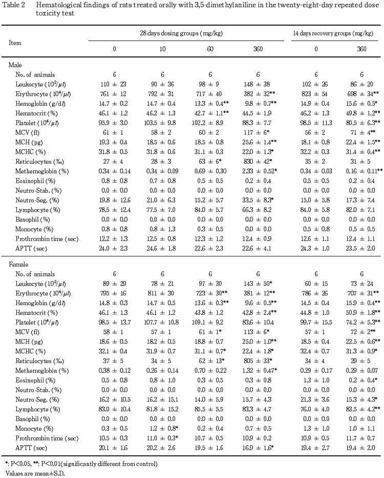 ·ì±Õ³Ø¸¡ºº¤Ç¤Ï¡¤60¤ª¤è¤Ó360 mg/kg·²¤Î»óͺ¤Ç¥á¥È¥Ø¥â¥°¥í¥Ó¥ó¤¬Áý²Ã¤·¤¿¡¥¤Þ¤¿¡¤Æ±·²¤Î»óͺ¤Ç¤ÏÀÖ·ìµå¿ô¡¤¥Ø¥â¥°¥í¥Ó¥óÎ̤ª¤è¤Ó¥Ø¥Þ¥È¥¯¥ê¥Ã¥ÈÃͤ¬¸º¾¯¤·¡¤ÉϷ줬ǧ¤á¤é¤ì¤¿¡¥ÀÖ·ìµå¹±¿ô¤Ç¤Ï¡¤MCV¤ª¤è¤ÓMCH¤ÏÁý²Ã¤ò¡¤MCHC¤Ï¸º¾¯¤ò¼¨¤·¤Æ¤¤¤ë¤³¤È¤«¤éÂçµåÀÉÏ·ì¤Ç¤¢¤ê¡¤360 mg/kg·²¤Ç¤Ï·ìÀ¶¥Ó¥ê¥ë¥Ó¥ó¤âÁý²Ã¤·¤¿¤³¤È¤«¤é¡¤ÉÏ·ì¤Ï¥á¥È¥Ø¥â¥°¥í¥Ó¥ó·ÁÀ®¤Ëµ¯°ø¤¹¤ëÍÏ·ì¤Ë¤è¤ë¤â¤Î¤È¹Í¤¨¤é¤ì¤¿¡¥ÍÏ·ì¤Ë´ØÏ¢¤¹¤ëÊѲ½¤È¤·¤Æ¡¤´Î¡¤ª¤è¤Óç£Â¡¤Î¥Ø¥â¥¸¥Ç¥ê¥óÄÀÃ夬60¤ª¤è¤Ó360 mg/kg·²¤Î»óͺ¤Ë¡¤¿Õ¡¤Î¥Ø¥â¥¸¥Ç¥ê¥óÄÀÃ夬360 mg/kg·²¤Î»óͺ¤Ëǧ¤á¤é¤ì¤¿¡¥360 mg/kg·²¤Î»óͺ¤Ç¤ß¤é¤ì¤¿·ìÀ¶GOT¤ª¤è¤ÓGPT¤ÎÁý²Ã¤Ë¤Ä¤¤¤Æ¤â¡¤´Î¡¤Ç¤³¤ì¤é¤Î°ïæ»ÀÁǤ¬Áý²Ã¤¹¤ë¤è¤¦¤ÊÉÂÊѤ¬¤ß¤é¤ì¤Æ¤¤¤Ê¤¤¤³¤È¤«¤é¡¤ÍÏ·ì¤Ë´ØÏ¢¤·¤¿ÊѲ½¤È¹Í¤¨¤é¤ì¤¿¡¥¤Þ¤¿¡¤ÉÏ·ì¤ËÂФ¹¤ëÂå½þÀ¤ÎÊѲ½¤È¤·¤Æ¡¤60¤ª¤è¤Ó360 mg/kg·²¤Î»óͺ¤Ç¤ÏËö¾¿·ì¤ÎÌÖ¾õÀÖ·ìµåΨ¤¬Áý²Ã¤·¡¤ÀÖ²êµå·Ï¤ò¼çÂΤȤ¹¤ëç£Â¡¤Ç¤Î¿ñ³°Â¤·ì¤¬60¤ª¤è¤Ó360 mg/kg·²¤Î»óͺ¤Ë¡¤´Î¡¤Ç¤Î¿ñ³°Â¤·ì¤¬360 mg/kg·²¤Î»óͺ¤Ëǧ¤á¤é¤ì¡¤¹ü¿ñ¤Ç¤â¤·ìж¿Ê¤¬60 mg/kg·²¤Îͺ¤ª¤è¤Ó360 mg/kg·²¤Î»óͺ¤Ëǧ¤á¤é¤ì¤¿¡¥¤Þ¤¿¡¤60¤ª¤è¤Ó360 mg/kg·²¤Î»óͺ¤Ç¤ß¤é¤ì¤¿ç£Â¡½ÅÎ̤ÎÁý²Ã¤ª¤è¤Ó360 mg/kg·²¤Î»óͺ¤Ç¤ß¤é¤ì¤¿´Î¡½ÅÎ̤ÎÁý²Ã¤â¿ñ³°Â¤·ì¤Ëȼ¤Ã¤¿ÊѲ½¤È¹Í¤¨¤é¤ì¤¿¤¬¡¤´Î¡¤Ë¤Ä¤¤¤Æ¤Ï¸å½Ò¤¹¤ë´ÎºÙ˦¤ÎÈîÂç¤â½ÅÎ̤ÎÁý²Ã¤Ë±Æ¶Á¤òÍ¿¤¨¤¿¤â¤Î¤È»×¤ï¤ì¤¿¡¥¤³¤Î¤Û¤«¡¤·ì±Õ³Ø¸¡ºº¤Ç¤Ï¡¤360 mg/kg·²¤Î»óͺ¤ÇÇò·ìµå¿ô¤ÎÁý²Ã¤¬¡¤Æ±·²¤Îͺ¤Ç¹¥ÃæµåÈæ¤ÎÁý²Ã¤¬Ç§¤á¤é¤ì¤¿¤Û¤«¡¤ 360 mg/kg·²¤Î»ó¤Ç³èÀ²½Éôʬ¥È¥í¥ó¥Ü¥×¥é¥¹¥Á¥ó»þ´Ö¤Îû½Ì¤¬Ç§¤á¤é¤ì¤¿¡¥Çò·ìµå¤ÎÁý²Ã¤Ë¤Ä¤¤¤Æ¡¤¤½¤Îµ¡½ø¤ÏÌÀ¤é¤«¤Ç¤Ï¤Ê¤¤¤¬¡¤Æ±·²¤Ç¤Ï±ê¾ÉÀÉÂÊѤϤߤé¤ì¤Æ¤¤¤Ê¤¤¤³¤È¤«¤é¡¤ÀÖ²êµå·Ï¤Î¤·ìж¿Ê¤Ëȼ¤Ã¤Æ¡¤ðùγµå·Ï¤Î¤·ì¤âж¿Ê¤·¤¿¤Î¤Ç¤Ï¤Ê¤¤¤«¤È»×¤ï¤ì¤¿¡¥°ìÊý¡¤³èÀ²½Éôʬ¥È¥í¥ó¥Ü¥×¥é¥¹¥Á¥ó»þ´Ö¤Ë¤Ä¤¤¤Æ¤Ï¡¤±äŤ·¤¿¾ì¹ç¤Ï´Î¾ã³²Åù¤Î»ØÉ¸¤È¤Ê¤ë¤¬¡¤Ã»½Ì¤·¤¿¾ì¹ç¤ÎÎ×¾²Åª°ÕµÁ¤ÏÌÀ¤é¤«¤Ç¤Ï¤Ê¤¤¡¥
