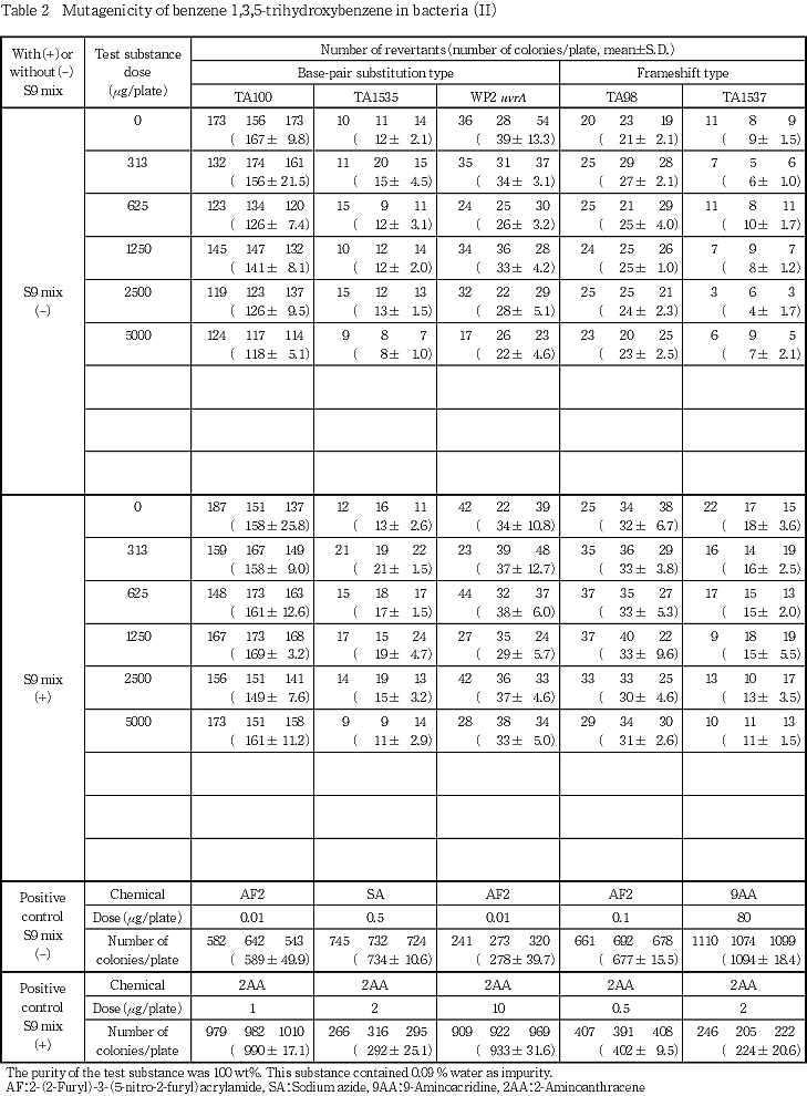 以上の結果から1,3,5-トリヒドロキシベンゼンは,用いた試験系において変異原性を有しないもの(陰性)と判定した.