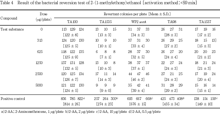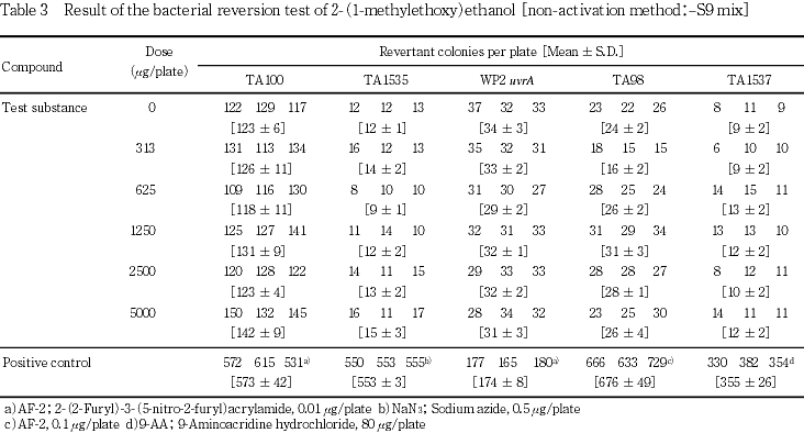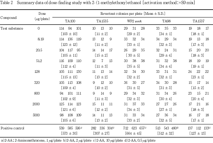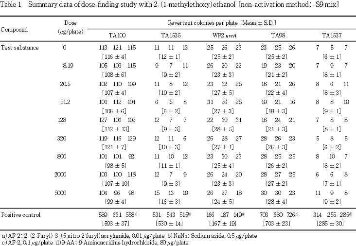 »î¸³¶Ý³ô¤È¤·¤Æ¡¤Salmonella typhimurium(TA100¡¤TA98¡¤TA1535¡¤TA1537)¤ª¤è¤ÓEscherichia coli(WP2 uvrA)¤Î5¶Ý³ô¤òÍѤ¤¤¿¡¥ÍÑÎÌÀßÄê»î¸³¤Ë¤ª¤¤¤Æ¤ÏS9 mix̵ź²Ã·²¤ª¤è¤Óź²Ã·²¤Î³Æ»î¸³¶Ý³ô¤Ë¤ª¤¤¤Æ8.19¡Á5000 ¦Ìg/plate¤Î8ÍÑÎÌ¡¤Ëܻ¤Ç¤Ï313¡Á5000 ¦Ìg/plate¤Î5ÍÑÎ̤ǻ¤ò¼Â»Ü¤·¤¿¡¥