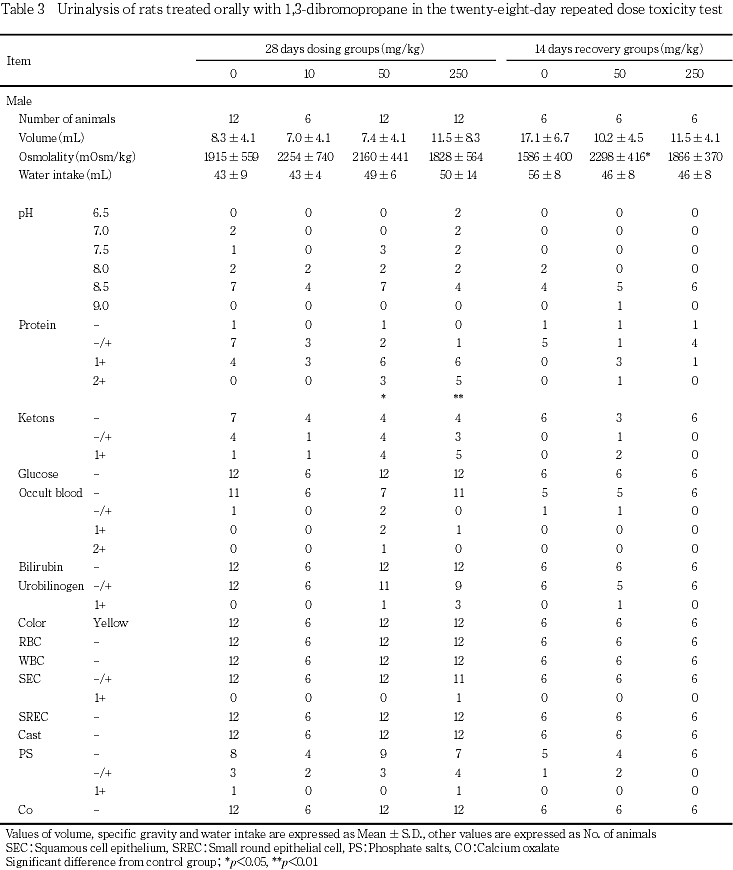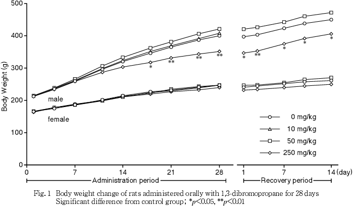 これらの結果から,本試験における1,3-ジブロモプロパンの無影響量は雌雄ともに10 mg/kg/dayと推定された.