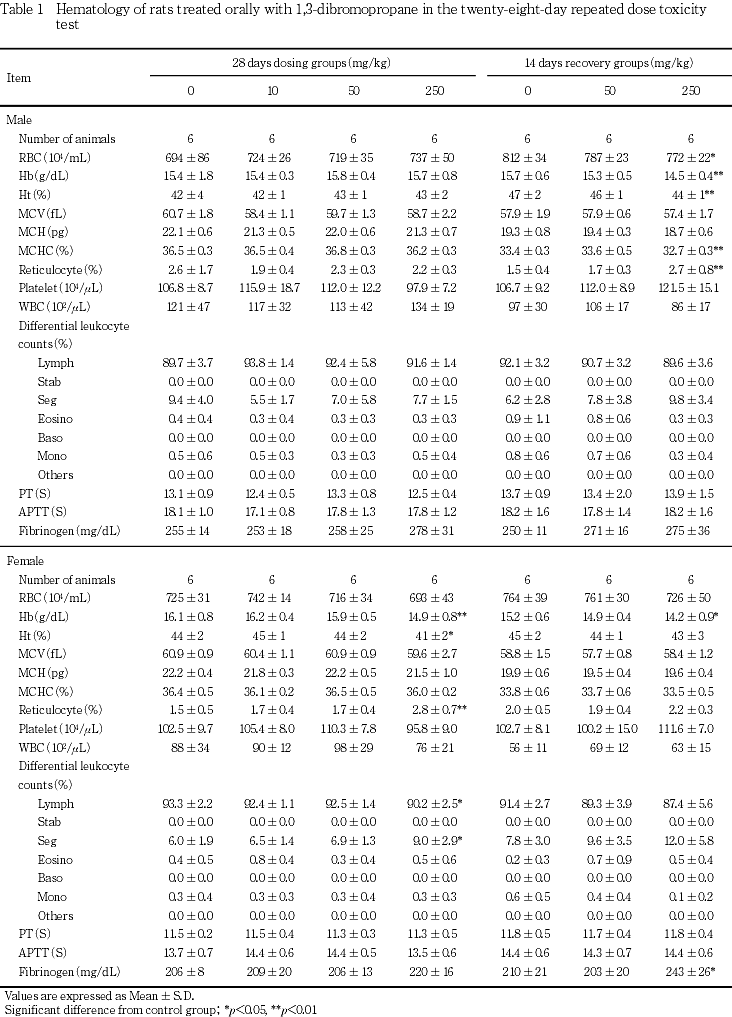 以上の如く,1,3-ジブロモプロパンをラットに28日間反復経口投与した結果,主な変化として250 mg/kg群の雌雄で流涎,貧血(ただし,雄では遅延性に発現),血中のたん白質および脂質の増加,肝重量の増加ならびに肝臓における小葉中心性の肝細胞肥大と小葉辺縁部の空胞の減少がみられた.50 mg/kg群ではこれらの変化のうち,小葉中心性の肝細胞肥大が雌雄に,肝臓重量の増加,小葉辺縁部の空胞の減少および血中たん白質の増加が雌にみられた.一方,10 mg/kg群では被験物質投与に起因する変化は認められなかった.