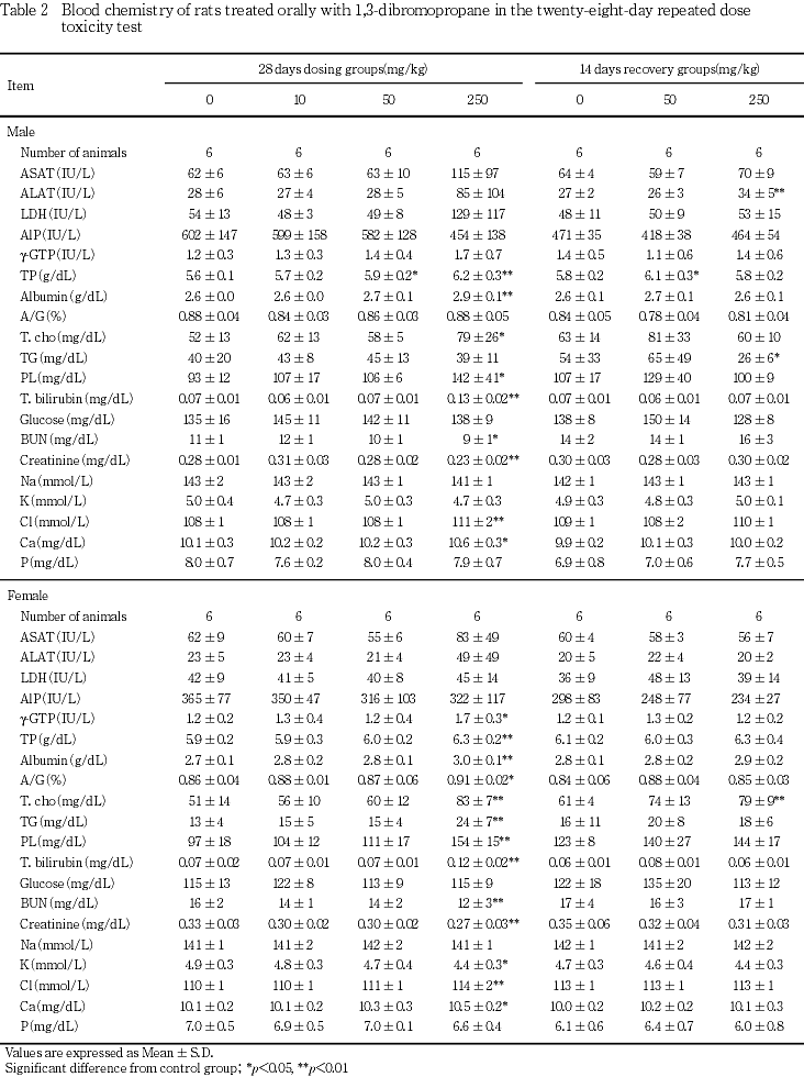 血液生化学検査では,50 mg/kg群の雄および250 mg/kg群の雌雄で総たん白質の増加がみられた.250 mg/kg群では,これに加えてASAT,ALATならびにγ-GTP活性,アルブミン,総コレステロール,リン脂質,総ビリルビン,塩素およびカルシウムの増加が雌雄に,LDH活性,A/G比およびトリグリセライドの増加とカリウムの減少が雌にみられた.