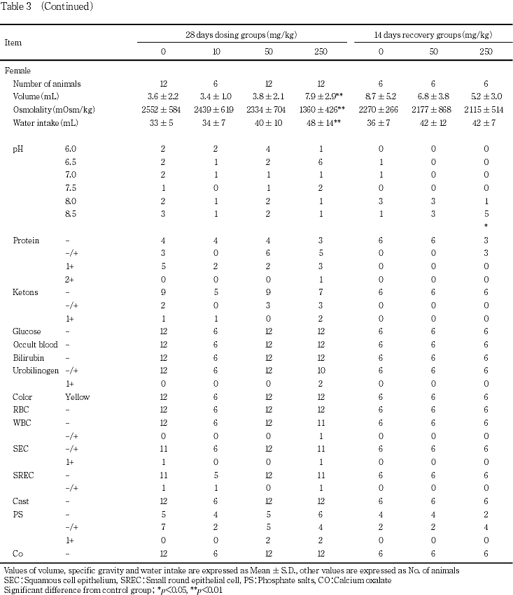 雌では,250 mg/kg群で尿量および摂水量の有意な増加と尿浸透圧の有意な減少がみられた.