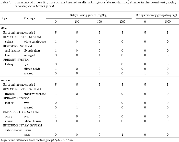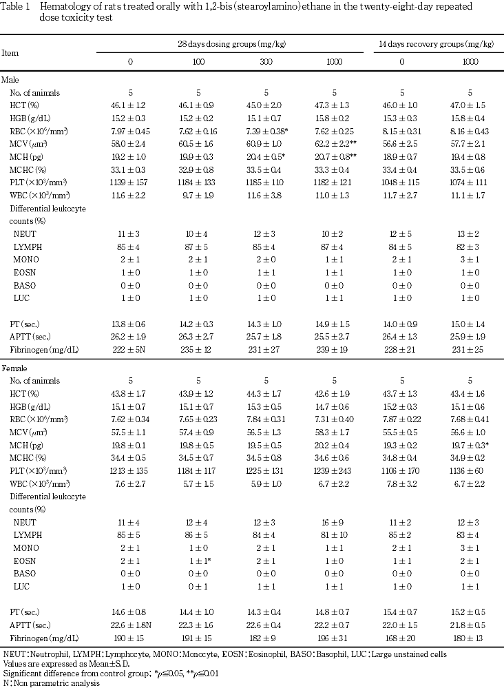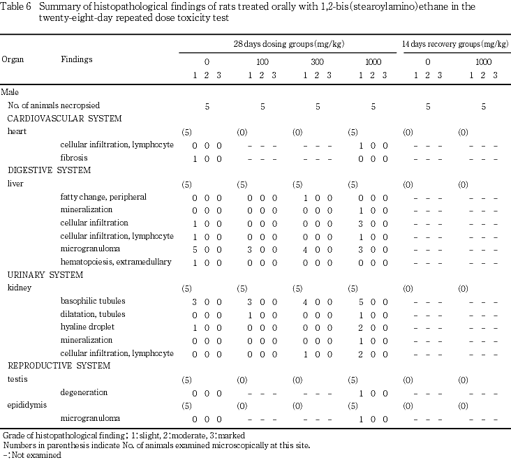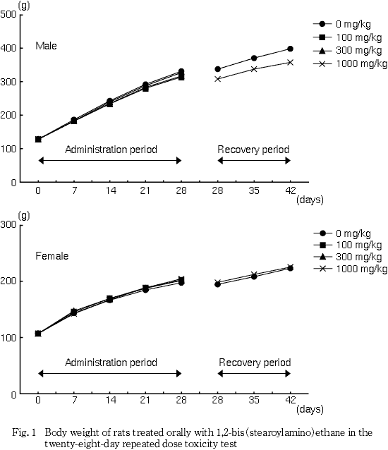 以上の結果から,本試験条件下における1,2-ビス(ステアロイルアミノ)エタンの無影響量は,雌雄とも被験物質に起因する変化が認められなかった1000 mg/kg/dayと考えられた.
