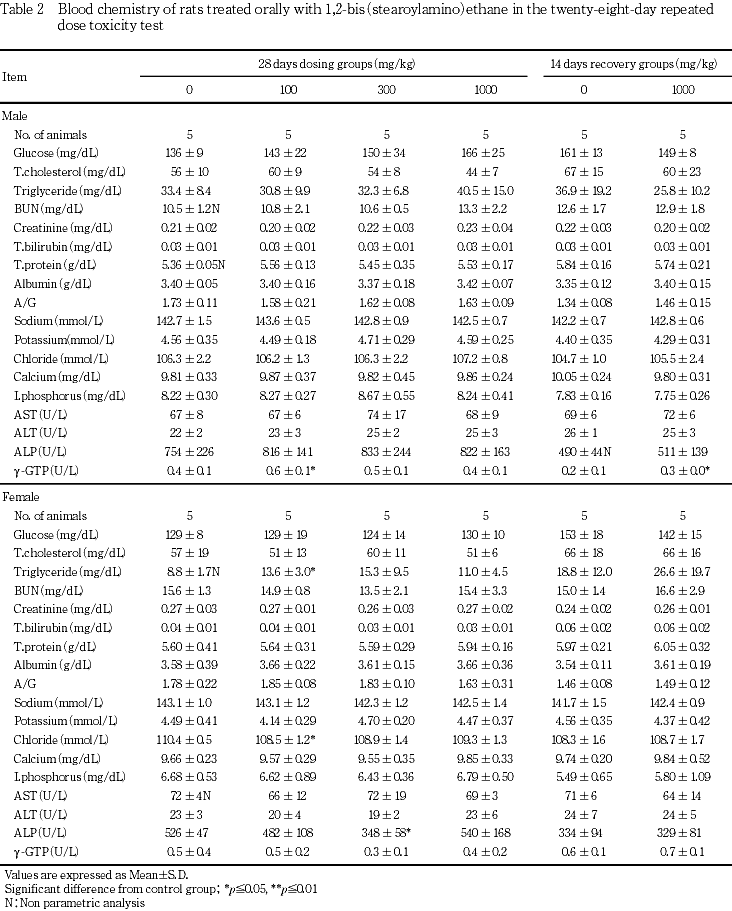 以上の結果から,本試験における1,2-ビス(ステアロイルアミノ)エタンの無影響量は雌雄とも被験物質に起因する変化が認められなかった1000 mg/kg/dayと判断された.