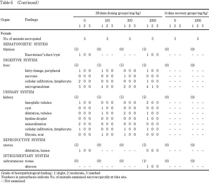心臓のリンパ球浸潤が雄の1000 mg/kg群に1例,線維化が雄の対照群に1例,胸腺のケルスタイナー氏嚢胞が雌の対照群および1000 mg/kg群にそれぞれ1例認められた.肝臓では周辺性脂肪化が雄の300 mg/kg群で1例,雌の対照群,100および1000 mg/kg群にそれぞれ1例,鉱質沈着が雄の1000 mg/kg群に1例,壊死が雌の300 mg/kg群で1例,細胞浸潤が雄の対照群および1000 mg/kg群に1および3例,リンパ球浸潤が雄の対照群および1000 mg/kg群にそれぞれ1例,雌の対照群および1000 mg/kg群に2および1例,小肉芽腫が雄の対照群,100,300および1000 mg/kg群に5,3,4および3例,雌の対照群,100,300および1000 mg/kg群に5,4,2および5例,髄外造血が雄の対照群に1例それぞれ認められた.腎臓では尿細管好塩基化が雄の対照群100,300および1000 mg/kg群に3,3,4および5例,雌の対照群および1000 mg/kg群に1および3例,嚢胞が雌の100 mg/kg群に1例,管腔拡張が雄の100および1000 mg/kg群でそれぞれ1例,雌の100,300および1000 mg/kg群で1,2および1例,硝子滴変性が雄の対照群および1000 mg/kg群に1および2例,雌の1000 mg/kg群に1例,鉱質沈着が雄の1000 mg/kg群に1例,雌の対照群に2例,リンパ球浸潤が雄の300および1000 mg/kg群で1および2例,雌の対照群,300および1000 mg/kg群にそれぞれ1例が認められた.精巣の変性と精巣上体の小肉芽腫が1000 mg/kg群でそれぞれ1例,子宮の内腔拡張が雌の対照群で1例に認められた.