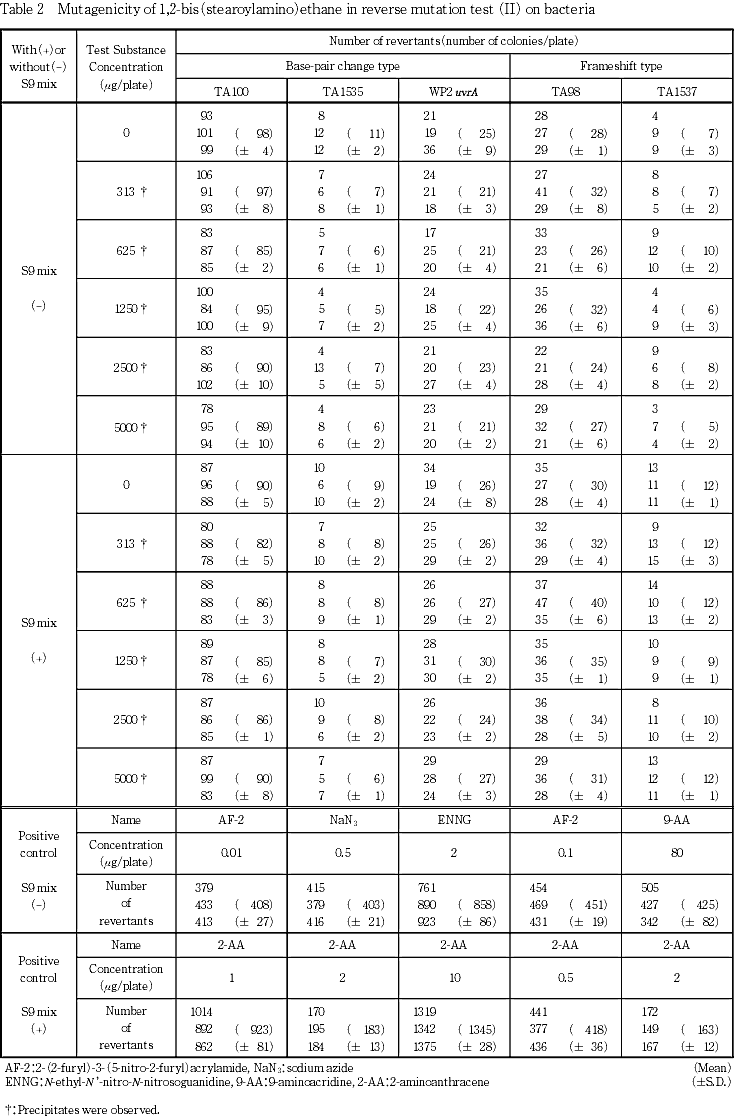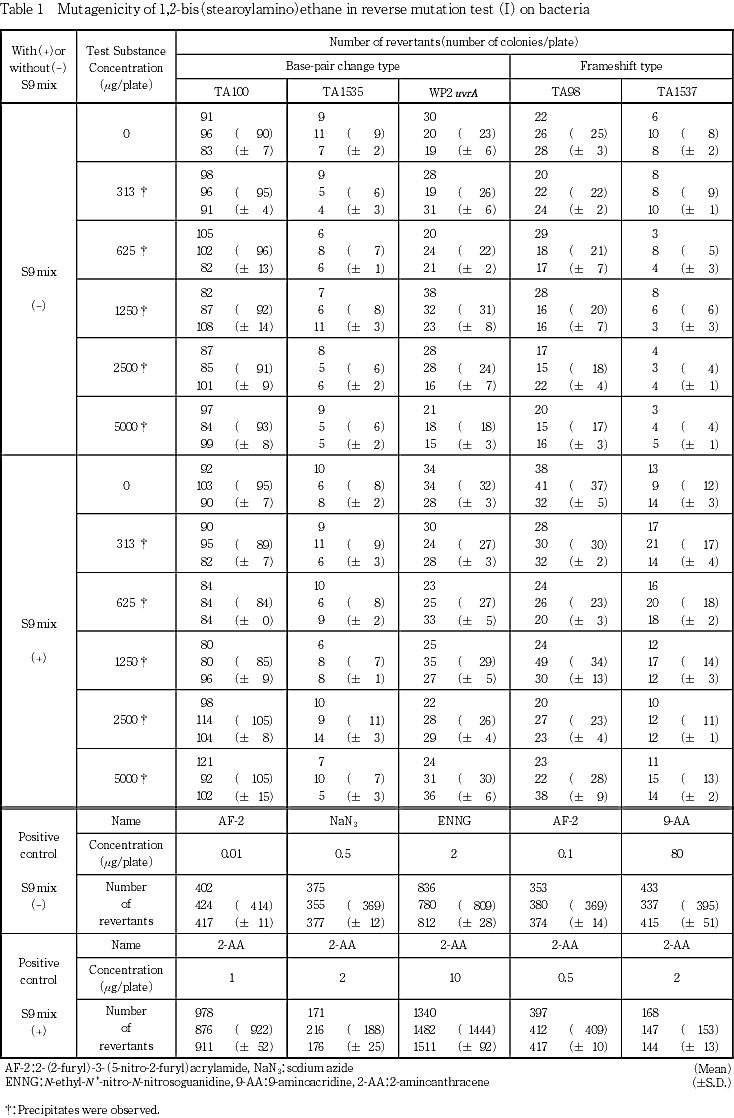 以上の結果から,1,2-ビス(ステアロイルアミノ)エタンは本試験系において変異原性を有さない(陰性)と判定した.