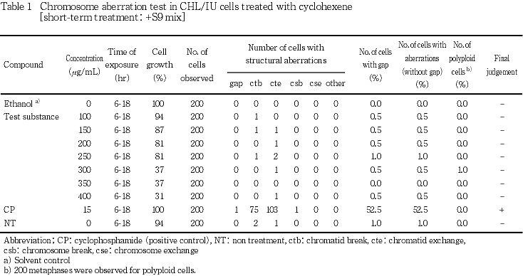 以上の結果から,シクロヘキセンは本試験条件下において染色体異常誘発能を有さない(陰性)と判定した.
