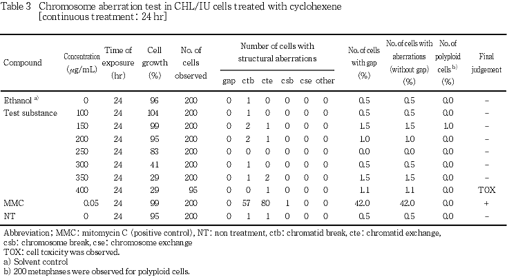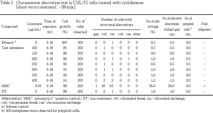 以上の結果から,シクロヘキセンは本試験条件下において染色体異常誘発能を有さない(陰性)と結論した.