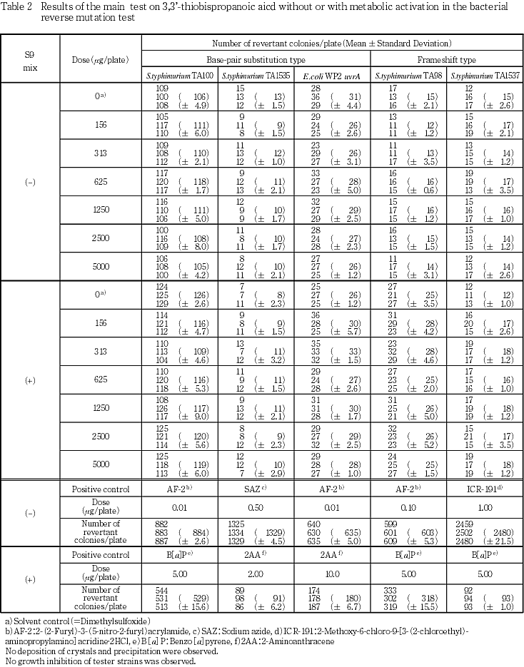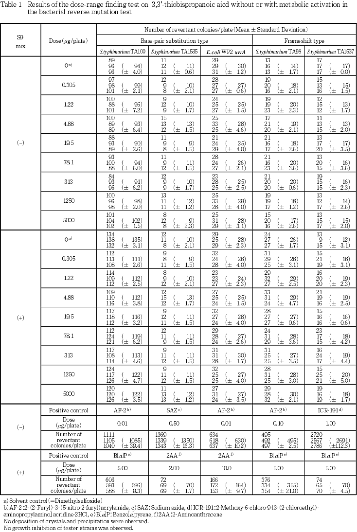 以上の結果より,本試験条件下において3,3'-チオビス(プロパン酸)は細菌に対して復帰突然変異誘発性を示さない(陰性)と判定した.