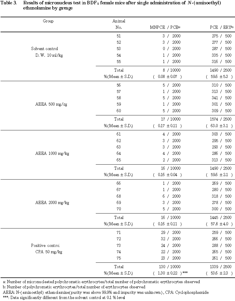 以上の結果から, N-(アミノエチル)エタノールアミンは,本試験条件下でCrj:BDF1雄および雌マウスの骨髄細胞において,小核誘発作用を示さないと結論した.