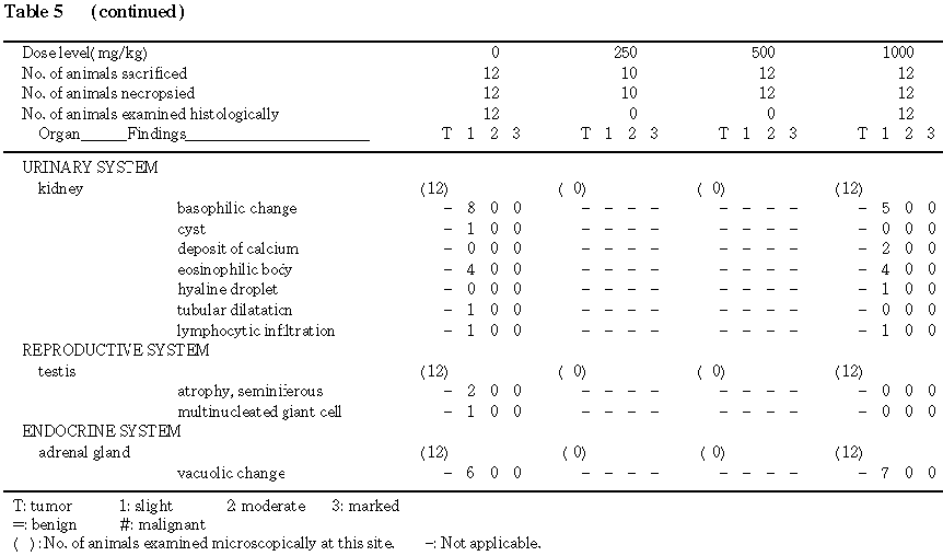 1000 mg/kg·²¤È¤Î´Ö¤ÇȯÀ¸¿ô¤Ëº¹¤Ï¤Ê¤«¤Ã¤¿¡¥Ç¥¿±¤òÀ®Î©¤µ¤»¤¿Íº¤Ç¤Ï´Î¡¤ÎÆù²êÁ㡤¿Õ¡¤ÎÇ¢ºÙ´É¾åÈé¤Î¹¥±ö´ðÀ²½¡¤¿Õ¡¤Î¹¥»ÀÀ¾®Âνи½¤ª¤è¤ÓÉû¿Õ¤Î¶õˤ²½¤¬Î¾·²¤ÎÈæ³ÓŪ¿¿ôÎã¤Ë´Ñ»¡¤µ¤ì¤¿¡¥¤½¤Î¾¤Î½ê¸«¤Ï¾¯¿ôÎ㤢¤ë¤¤¤ÏñȯÀ¤ÎȯÀ¸¤Ç¤¢¤Ã¤¿¡¥¤Ê¤ª¡¤´ï´±½ÅÎ̤ˤª¤¤¤Æ1000 mg/kg·²¤Ç¼Â½ÅÎ̤ÎÁý²Ã¤¬Ç§¤á¤é¤ì¤¿¶»Á£¤Ë¤Ä¤¤¤Æ¤Ï°Û¾ï¤Ïǧ¤á¤é¤ì¤Ê¤«¤Ã¤¿¡¥¤Þ¤¿¡¤¼«Á³Ê¬ÊÚ¤·¤¿»ó¤Ç¤Ïç£Â¡¤Î¿§ÁÇÄÀÃ塤Ç٤Υޥ¯¥í¥Õ¥¡¡¼¥¸½¸äÈ¡¤´Î¡¤ÎÆù²êÁ㡤¿Õ¡¤ÎÇ¢ºÙ´É¾åÈé¤Î¹¥±ö´ðÀ²½¤ª¤è¤Ó¶õˤ²½¤Ê¤É¤ÎÊѲ½¤¬Î¾·²¤Î¾¯¿ôÎã¤Ë´Ñ»¡¤µ¤ì¤¿¡¥¤½¤Î¾¤Î½ê¸«¤â¾¯¿ôÎ㤢¤ë¤¤¤ÏñȯÀ¤ÎȯÀ¸¤Ç¤¢¤Ã¤¿¡¥