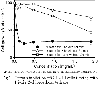 S9 mix非存在下での短時間処理(6時間処理後18時間の回復時間)では,1.9 mg/mL(10 mmol/L)においても細胞増殖抑制は認められなかった.S9 mix存在下での短時間処理では,50 %増殖抑制濃度は0.060 mg/mLとなった.また,連続処理(24時間処理)した場合,50 %増殖抑制濃度は1.8 mg/mLとなった.