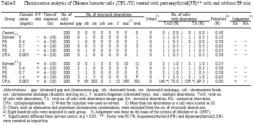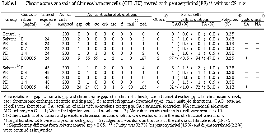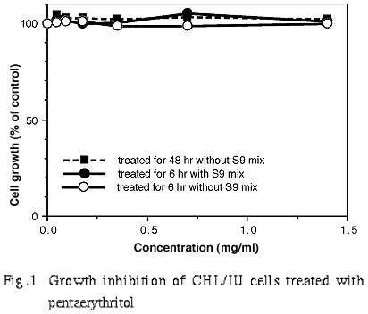 従って,ペンタエリスリトールは,上記の試験条件下で,試験管内のCHL/IU細胞に染色体異常を誘発しないと結論した.