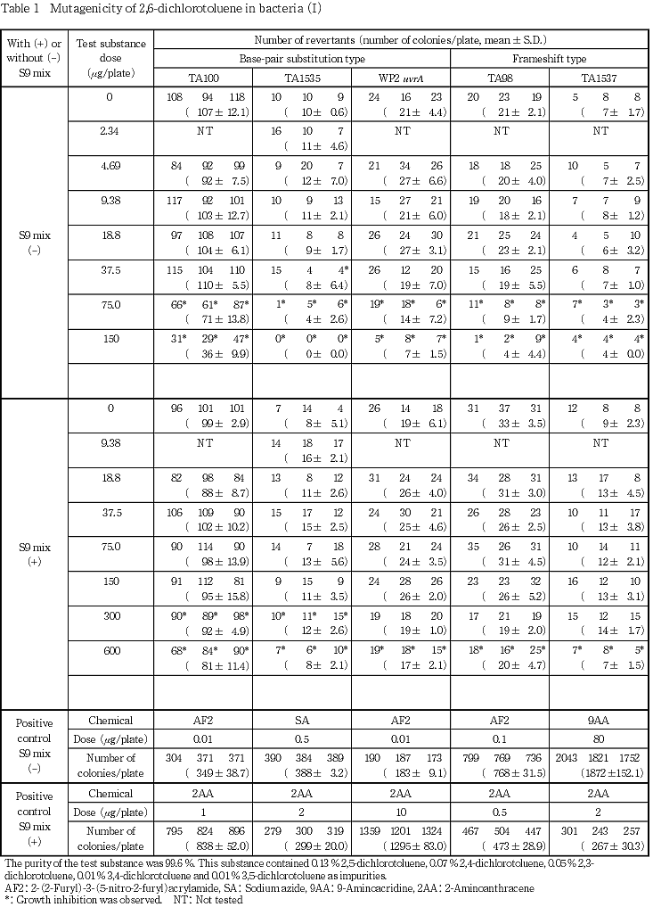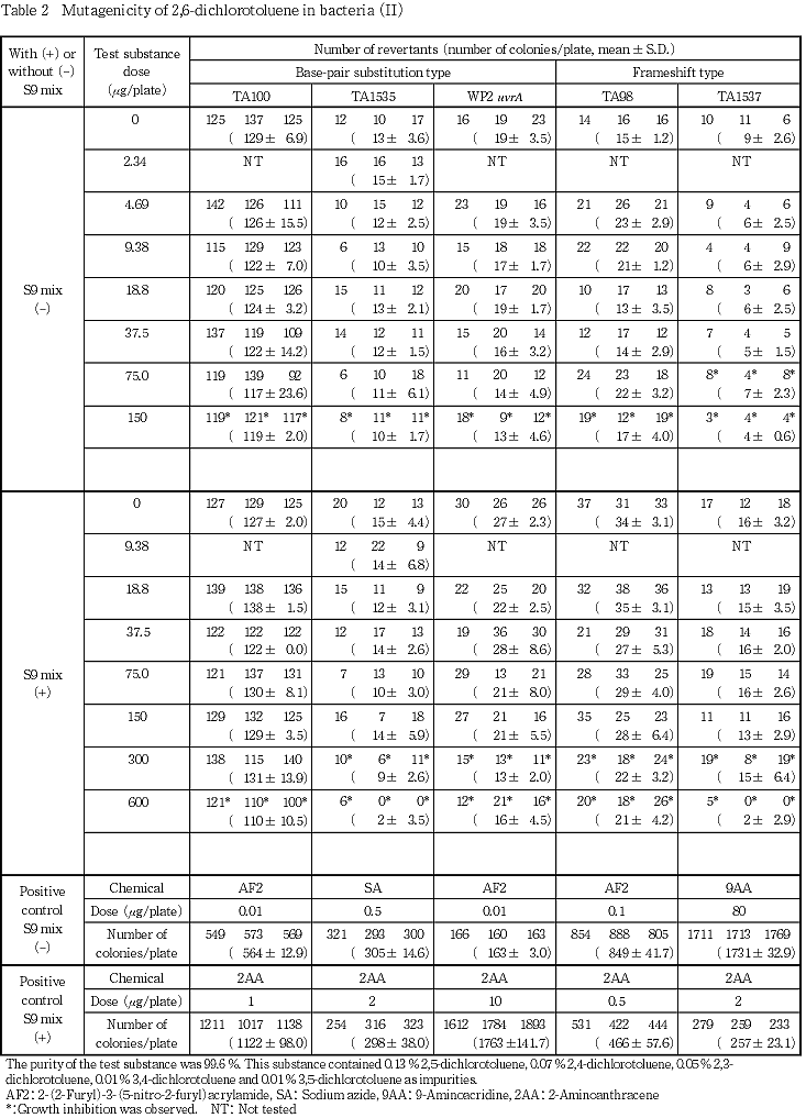 以上の結果に基づき,2,6-ジクロロトルエンは,用いた試験系において変異原性を有しないもの(陰性)と判定した.