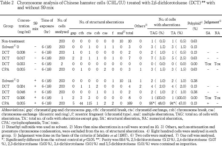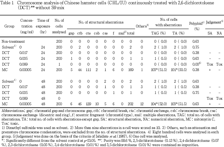 以上の結果より,本試験条件下で2,6-ジクロロトルエンは,染色体異常を誘発しない(陰性)と結論した.