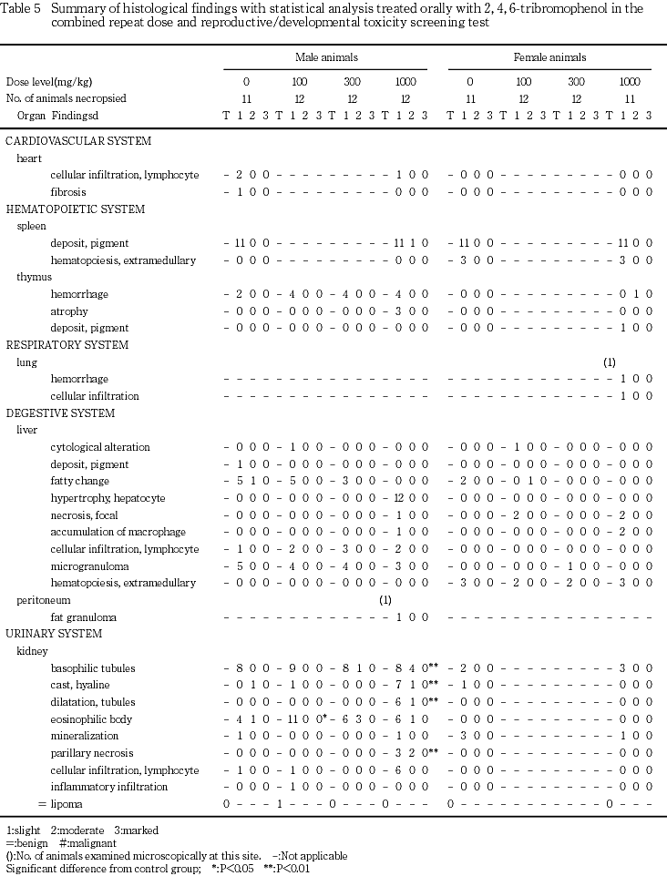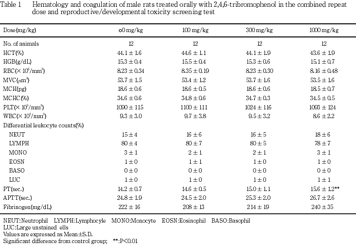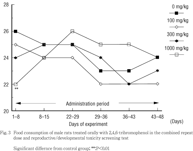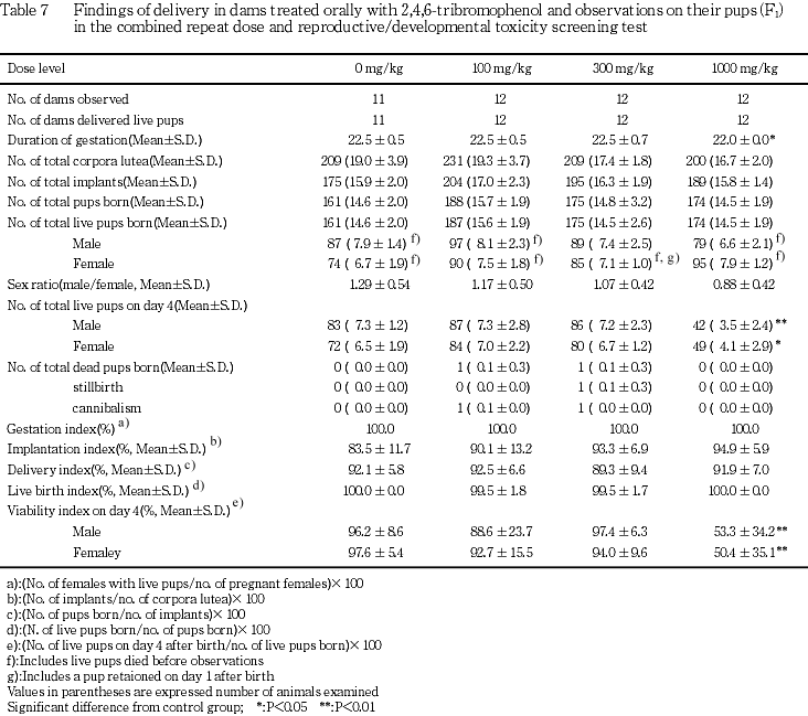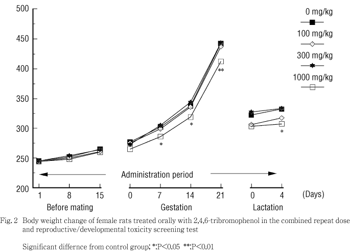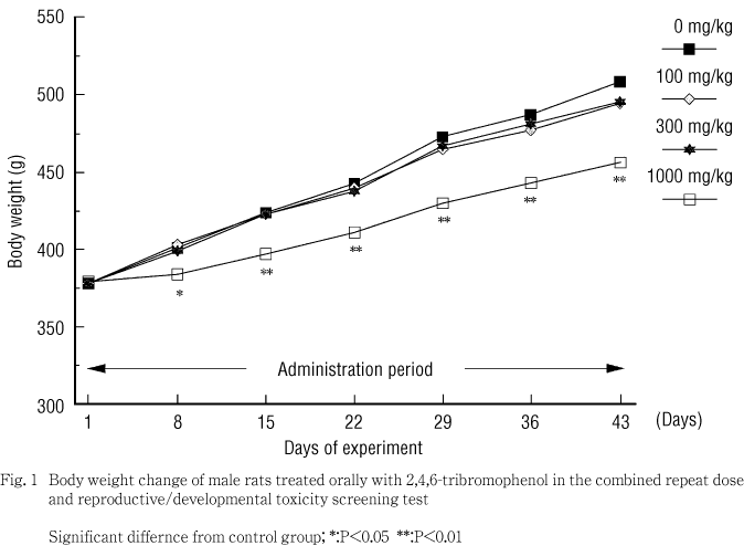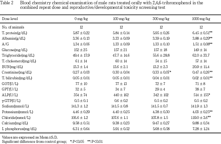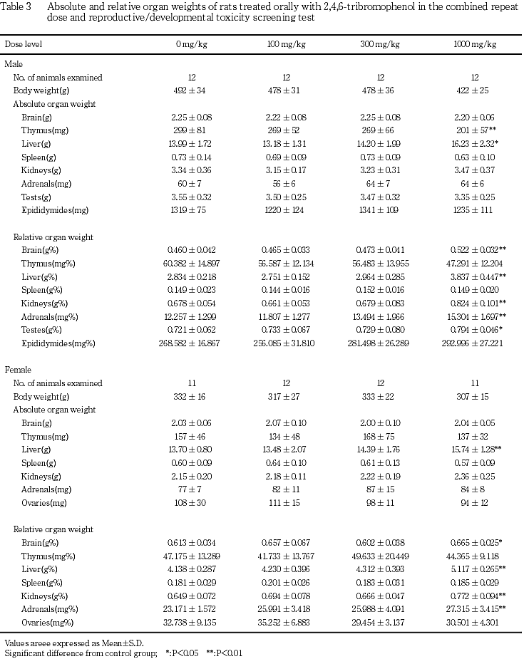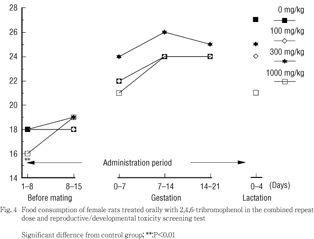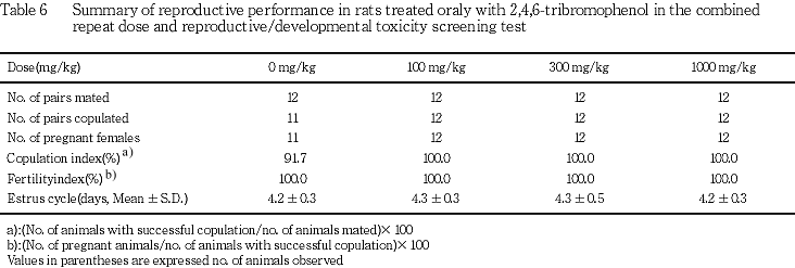 以上のことから,2,4,6-トリブロモフェノールの雌雄の生殖に及ぼす影響は1000 mg/kg/day投与でも認められず,無影響量は1000 mg/kg/dayと判断された.