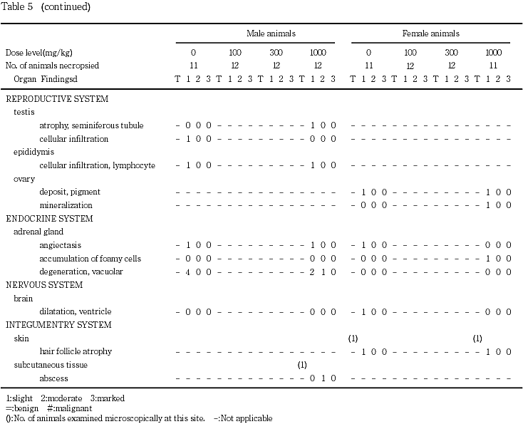 雄では,1000 mg/kg群で胸腺の萎縮が3例,肝細胞肥大が12例,腎臓の硝子円柱が8例,尿細管拡張が7例,腎乳頭壊死が5例,リンパ球浸潤が6例に発生し,対照群と比べて統計学的に有意な発生率の増加が認められた.また,肝臓の脂肪化が対照群で6例の発生に対し,1000 mg/kg群では認められず有意な減少を示した.さらに腎尿細管の好塩基化が対照群,100,300および1000 mg/kg群でそれぞれ8(全例軽度),9(全例軽度),9(軽度8,中等度1)および12例(軽度8,中等度4)観察され,発生率に有意差は認められなかったが1000 mg/kg群で程度の増強が認められた.一方,100 mg/kg群で腎臓の好酸性小体の発生率に有意な高値が認められたが,用量に関連した発現の増加および程度の増強は認められなかった.脾臓の色素沈着,胸腺の出血,肝臓の小肉芽腫および副腎束状帯の空胞変性が対照群を含め比較的多く観察されたが発生率に有意な変化は認められなかった.なお,1000 mg/kgの雄の1例に認められた皮下の塊は,組織学的には膿瘍であった.その他,観察された所見は単発性あるいは少数例の発生であった.