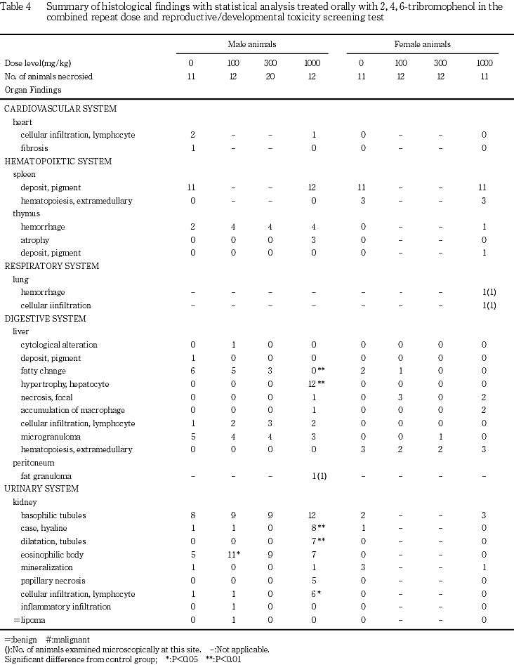 以上の結果から,本試験条件下では2,4,6-トリブロモフェノールの反復投与により投与後の一般状態の変化で雌雄の300 mg/kg以上の投与群で流涎が観察され,雌雄ともに1000 mg/kg群で体重の増加抑制および摂餌量の低値が認められた.さらに,雄の血液生化学検査で300 mg/kg以上の投与群でクレアチニンが高値を示し,1000 mg/kg群の病理学検査および血液生化学検査において,被験物質投与による主として肝臓および腎臓に及ぼす影響が示唆される変化が認められた.したがって,雌雄とも無影響量(NOEL)は100 mg/kg/dayと判断された.雌雄の生殖能に及ぼす影響は1000 mg/kg/day投与でも認められず,無影響量は1000 mg/kg/dayと判断された.児動物の発生・発育に及ぼす影響は1000 mg/kg/day投与で発育抑制が認められ,哺育4日生児数および生存率が低値を示したことから無影響量は300 mg/kg/dayと判断された.