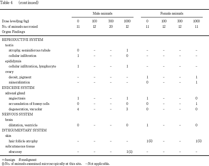 雌では,胸腺の赤色斑点,肺の褐色斑点,肝臓の肥大,瘢痕および白色斑点,卵巣の嚢胞,子宮の内腔拡張,副腎の肥大および被毛の菲薄化が対照群を含む各群に1ないし少数例に観察された.