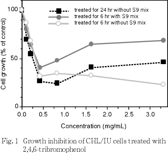 その結果,連続処理における50 %細胞増殖抑制濃度は0.25 mg/mL,S9 mix非存在下および存在下における短時間処理では,それぞれ0.31 mg/mLおよび0.33 mg/mLであった(Fig. 1).