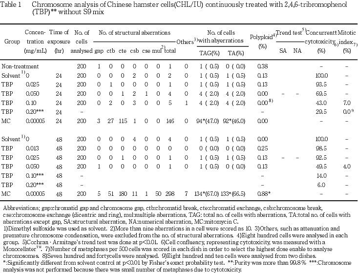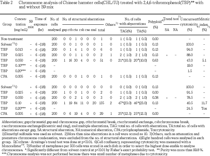 以上の結果より,本試験条件下で2,4,6-トリブロモフェノールは,染色体異常を誘発する(陽性)と結論した.